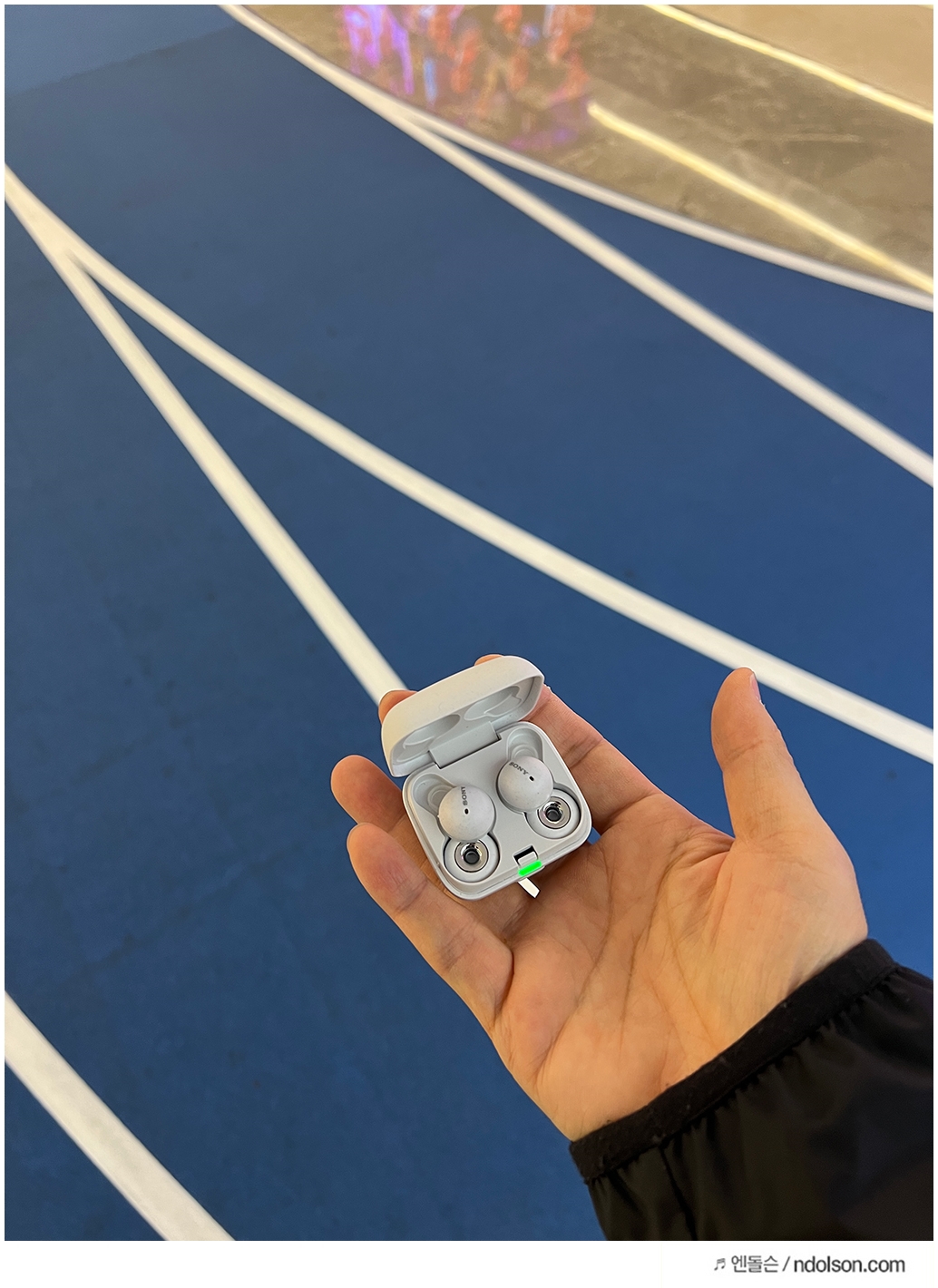트랙 위에서 촬영하였는데요. 평소 일할 때 사용하는 일잘러이지만, 운동할 때는 버즈링크가 매우 좋습니다. 바로 운동을 하면서 경험했는데 잘빠지지 않으면서도 귓구멍이 오픈되어 있어 답답하지 않아 좋네요.