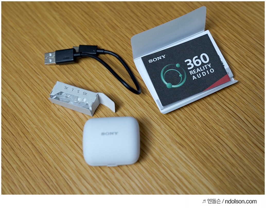 소니 링크버즈를 언박싱하여 열어보니, 무선이어폰 본체, 사이즈별 이어팁, USB-C 단자 충전 케이블, 360 리얼리티 사운드 체험 쿠폰, 매뉴얼로 구성되어 있습니다.