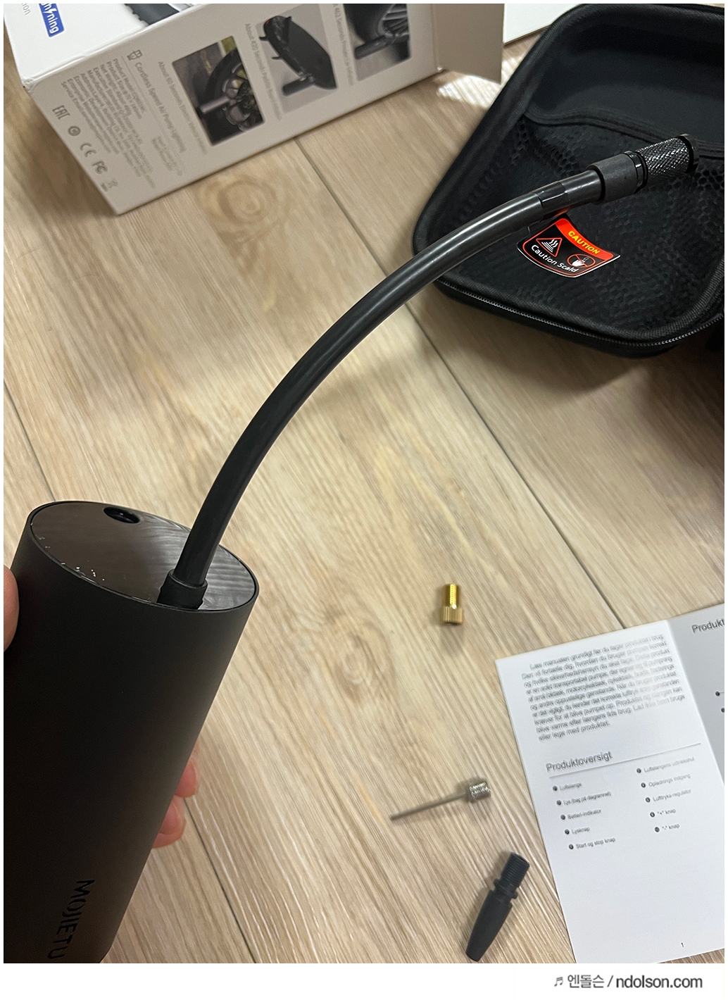 노즐은 3개 제공됩니다. 노란색 노즐을 꽂아 로드 자전거에 타이어에 바람을 넣을 수 있습니다.