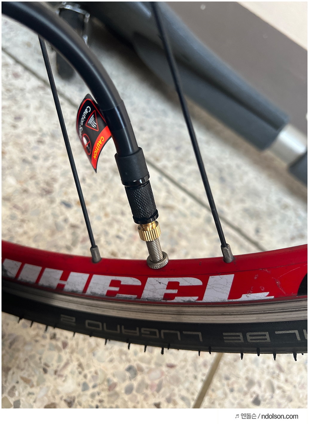 로드 자전거에 노란색 노즐을 연결합니다. 노란색 노즐 바로 위의 검정색을 계속 돌려서 고정해주면 됩니다. 안되면 몸체를 같이 돌려서 단단히 고정해주어야 합니다.