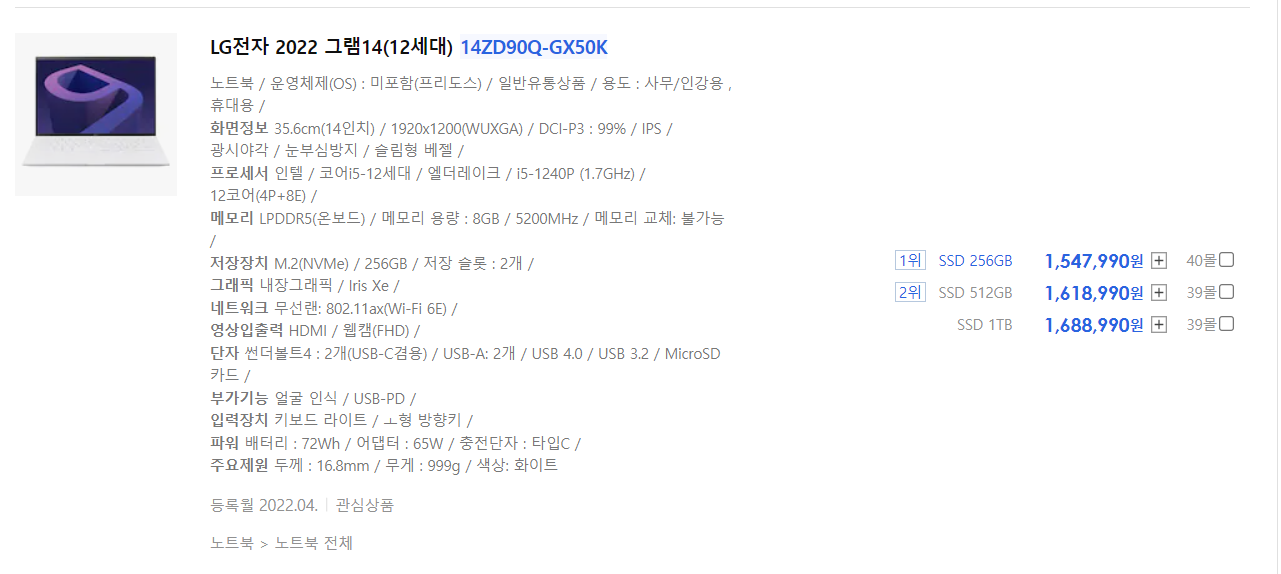 이번에 최저가 할인을 검색해보니 한정수량으로 저렴하게 팔고 있어 알려드립니다. 다나와에서 검색해보니 2022년 LG 그램 14ZD90Q-GX50K이 150만원~160만원입니다. SSD 256GB/512GB 인지에 따라 가격 차이가 나는데요.