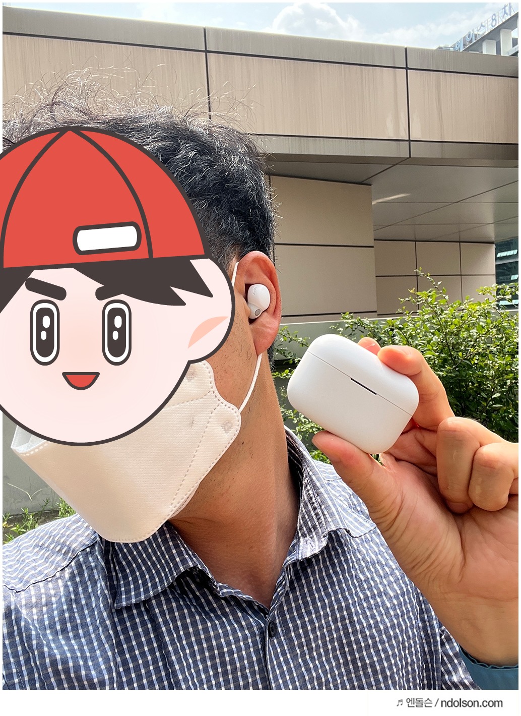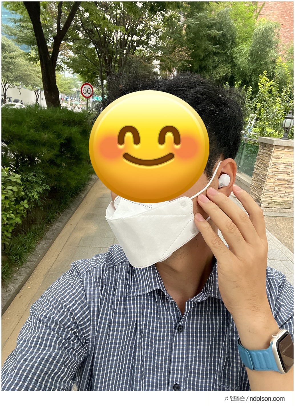 아주 잠깐 주변 소리 듣기를 해야 할 때는 왼쪽 귀에 손을 가져다 대면 주변 소리가 들립니다. 이건 아주 잠깐 주변 소리를 듣고 다시 음악으로 집중할 수 있어서 애용하는데요. 상당히 편리합니다.