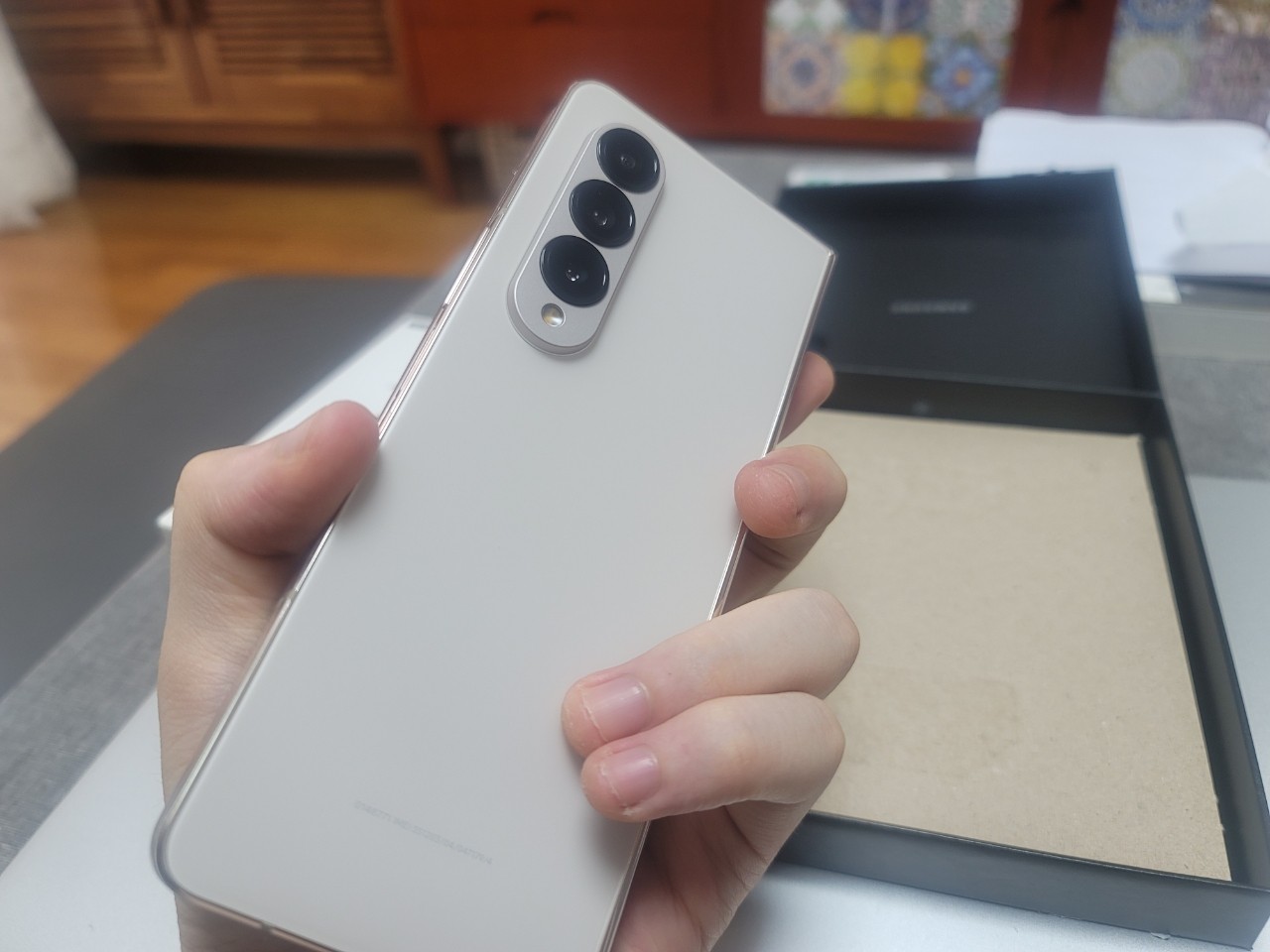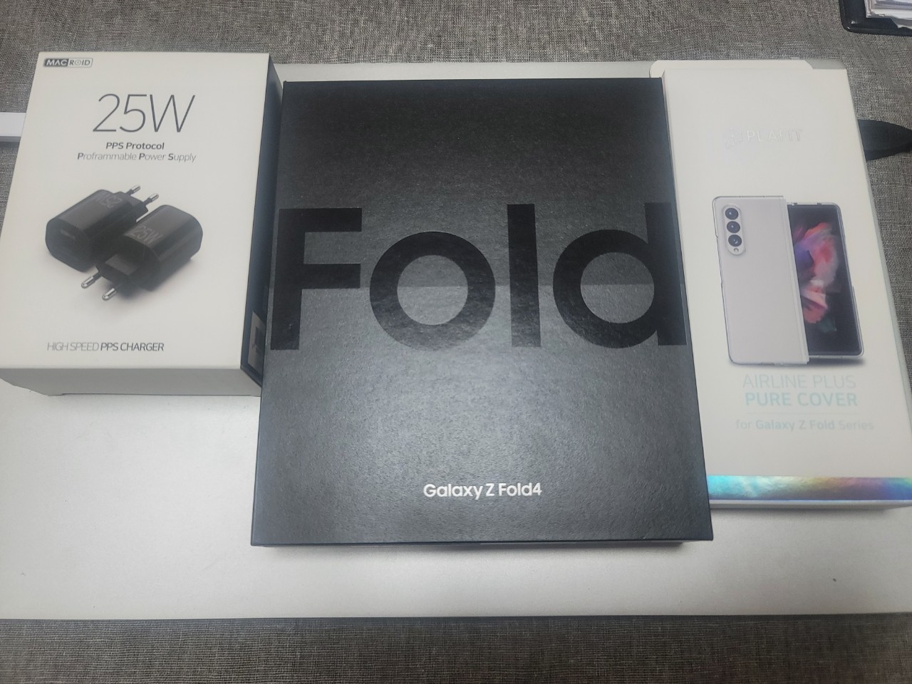 갤럭시Z폴드4 개봉기 패키지입니다. Galaxy Z Fold4 와 25W 고속충전 케이스와 기본 사은품으로 구성되어 있습니다.