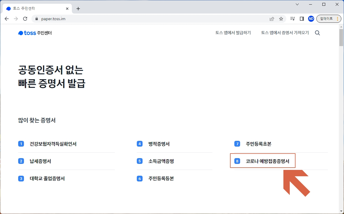 토스 주민센터에서 [코로나 예방접종증명서]를 눌러 발급합니다.