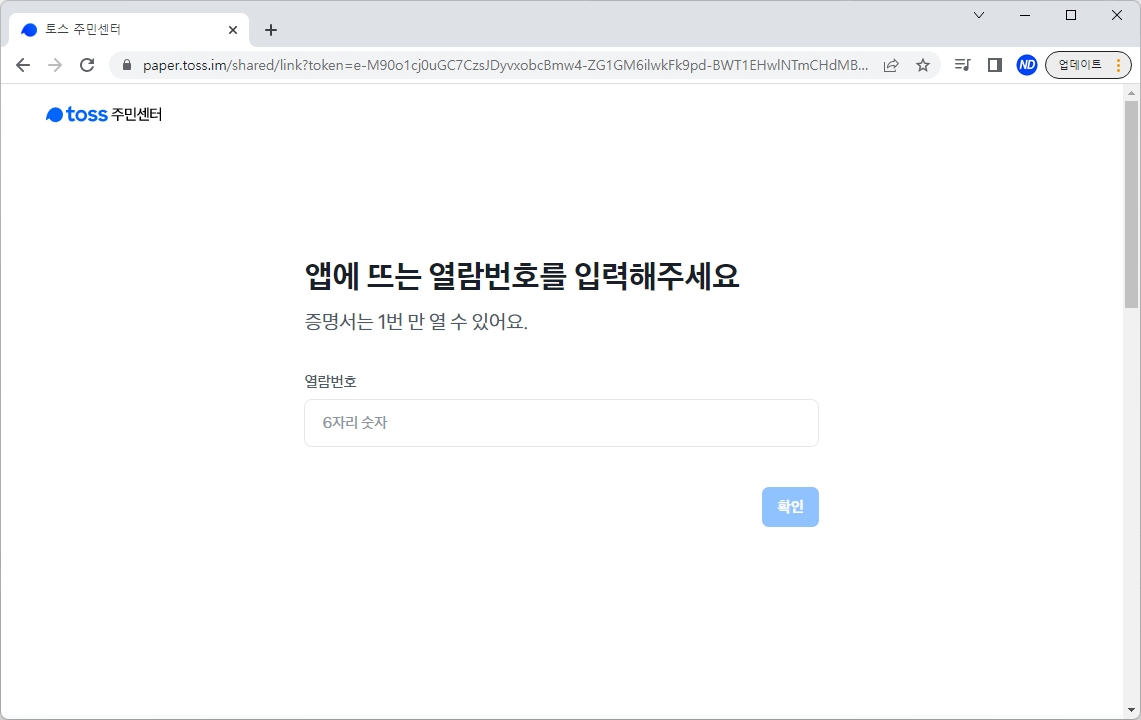 토스 앱에서 보이는 열람번호를 PC 컴퓨터에 입력해줍니다.