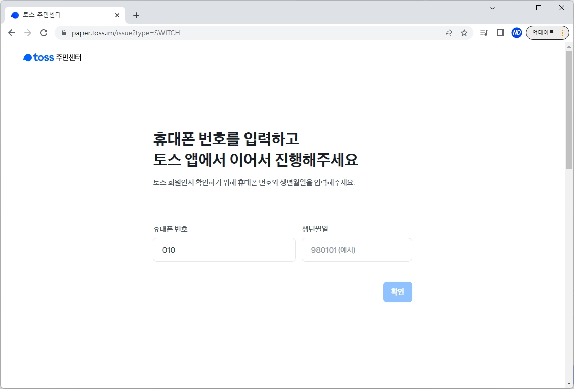 이제 휴대폰 번호와 생년월일을 입력하고 확인을 눌러줍니다.