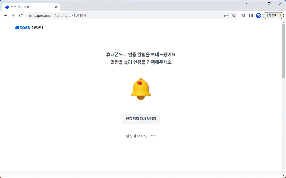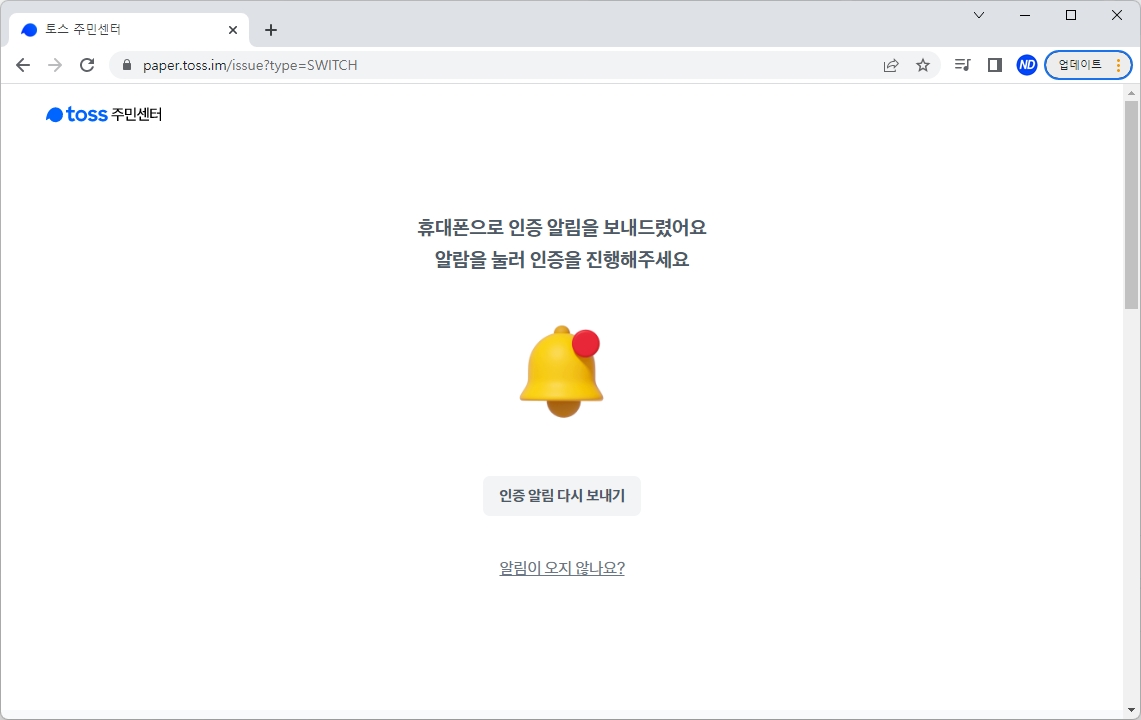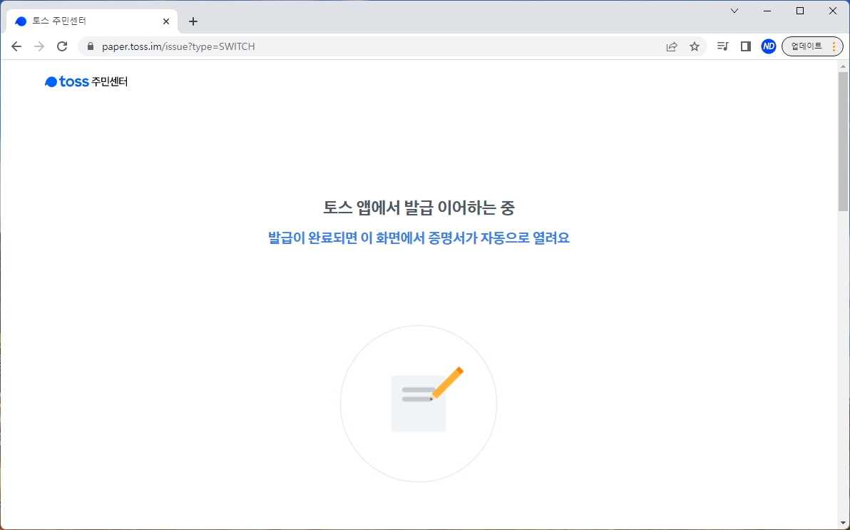 이제 토스 앱에 알림이 뜹니다. 주민등록등본 증명서를 토스 앱에서 이어서 발급하면 됩니다. 당연히 이때 토스 앱이 설치되어 있어야겠죠? (안되어 있다면 토스 앱 설치해주세요!)