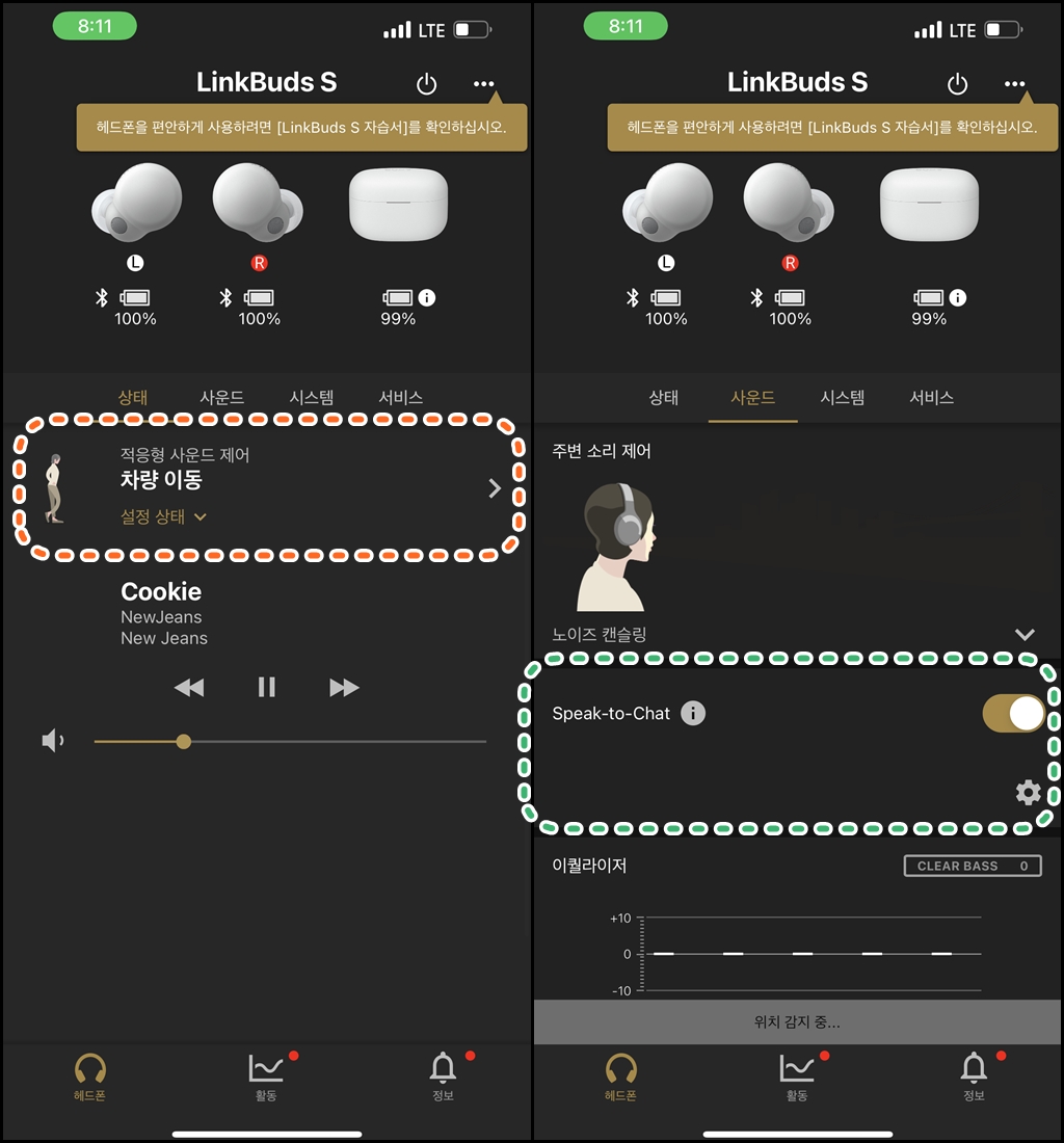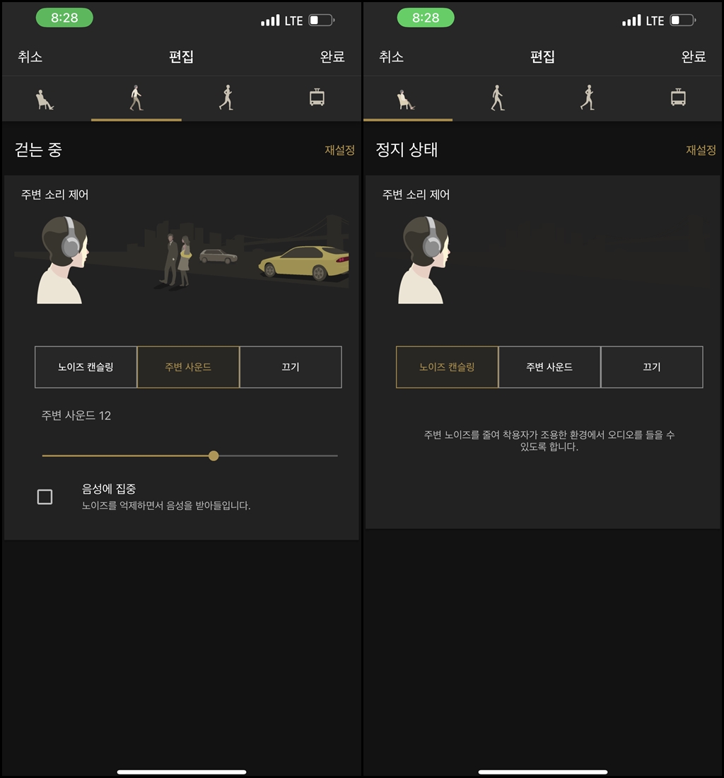 적응형 사운드 제어를 설정해두면, 알아서 주변의 상황에 따라 노이즈캔슬링 / 주변소리 듣기를 해줍니다.