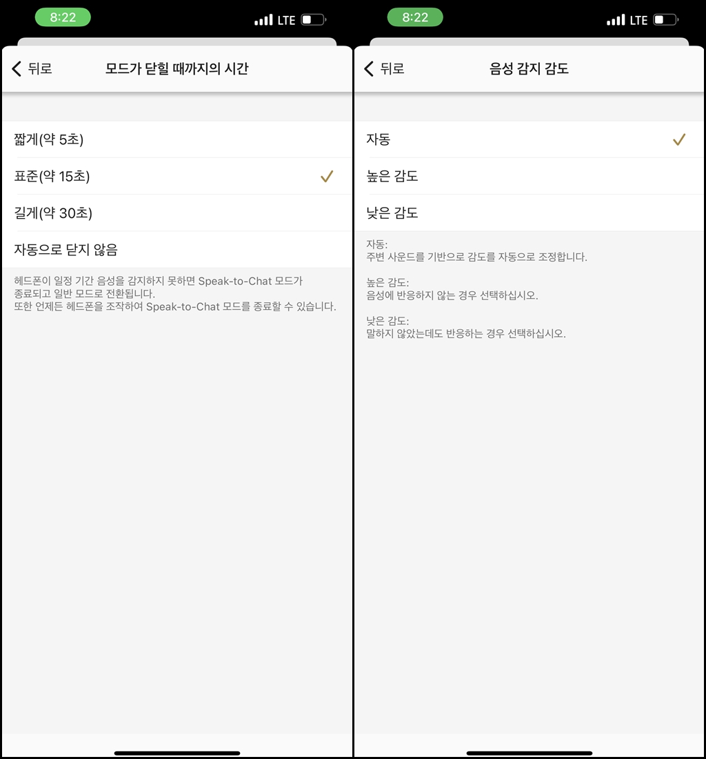 또 회사에서 갑자기 누군가 말을 걸어올 때 편리한 speak to chat 이 켜져 있으면 음악이 잠시 중지됩니다. 5초~30초 설정이 가능하고 감도 조절도 가능해서 편리한데요. 회사에서는 15초가 적당한 것 같았습니다. 대화를 계속 이어가게 되면 알아서 꺼지게 됩니다.