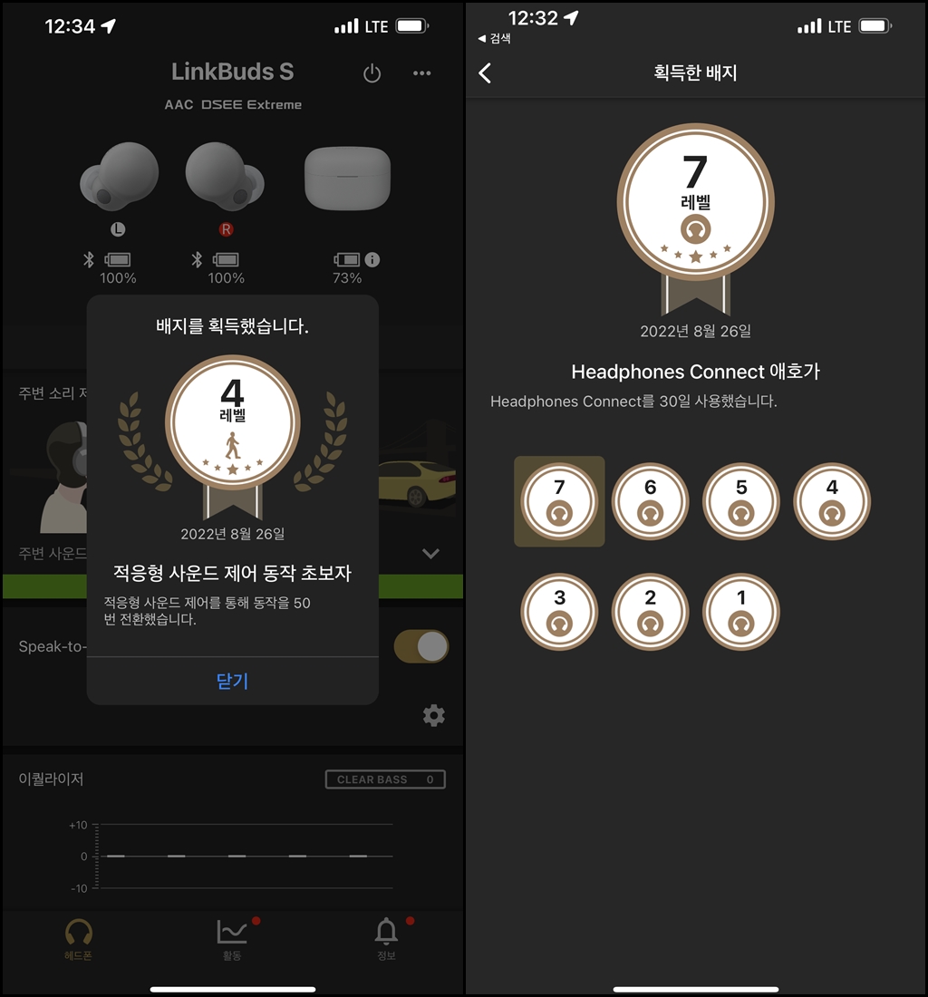 소니 앱(sony headphones connect)에서 적응형 사운드 제어 동작 초보가 되었다고 배지도 획득했네요. 정말 편하게 사용하고 있는데요.