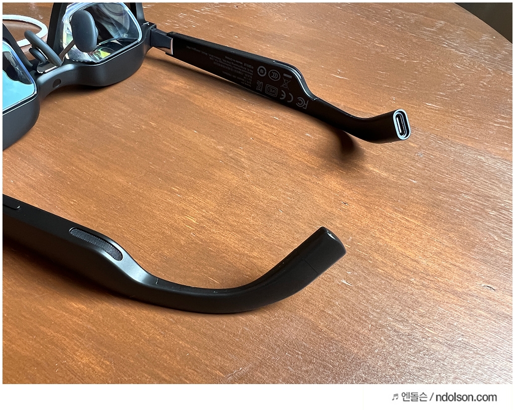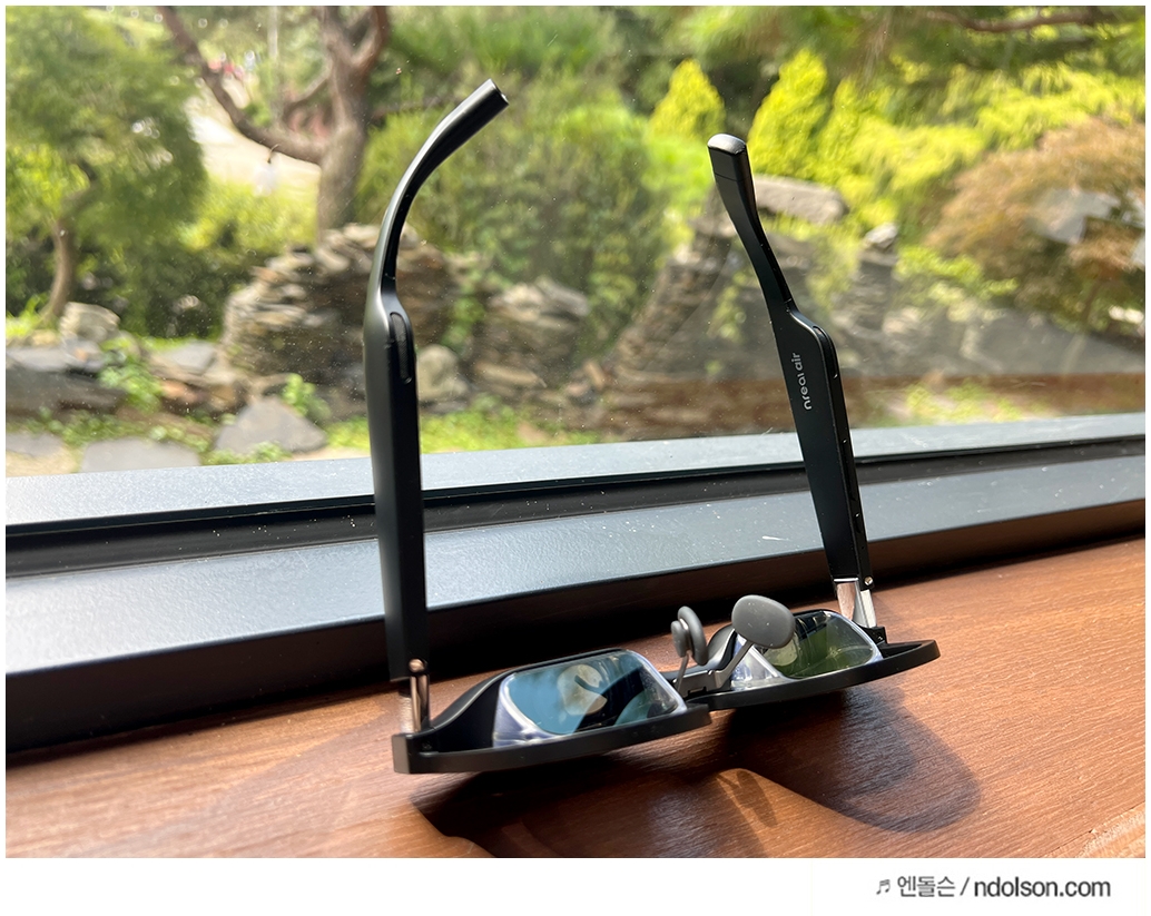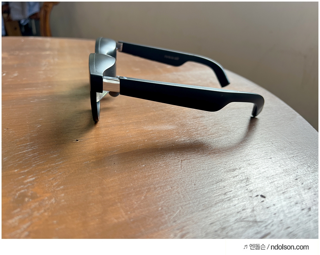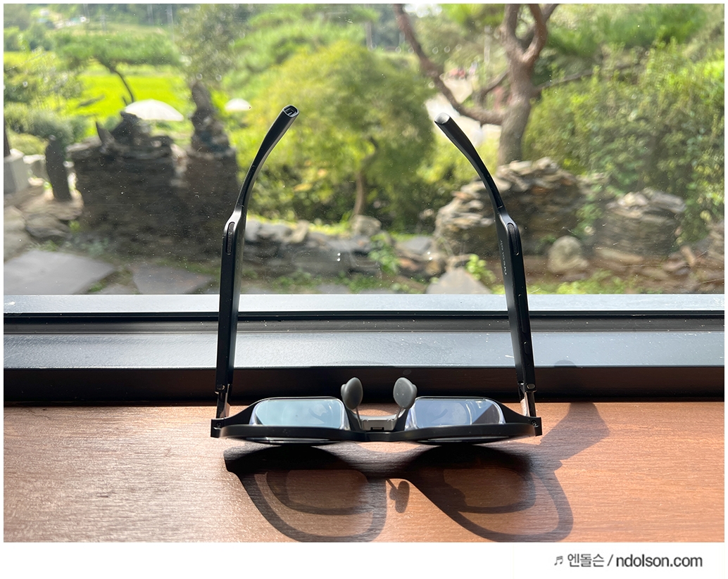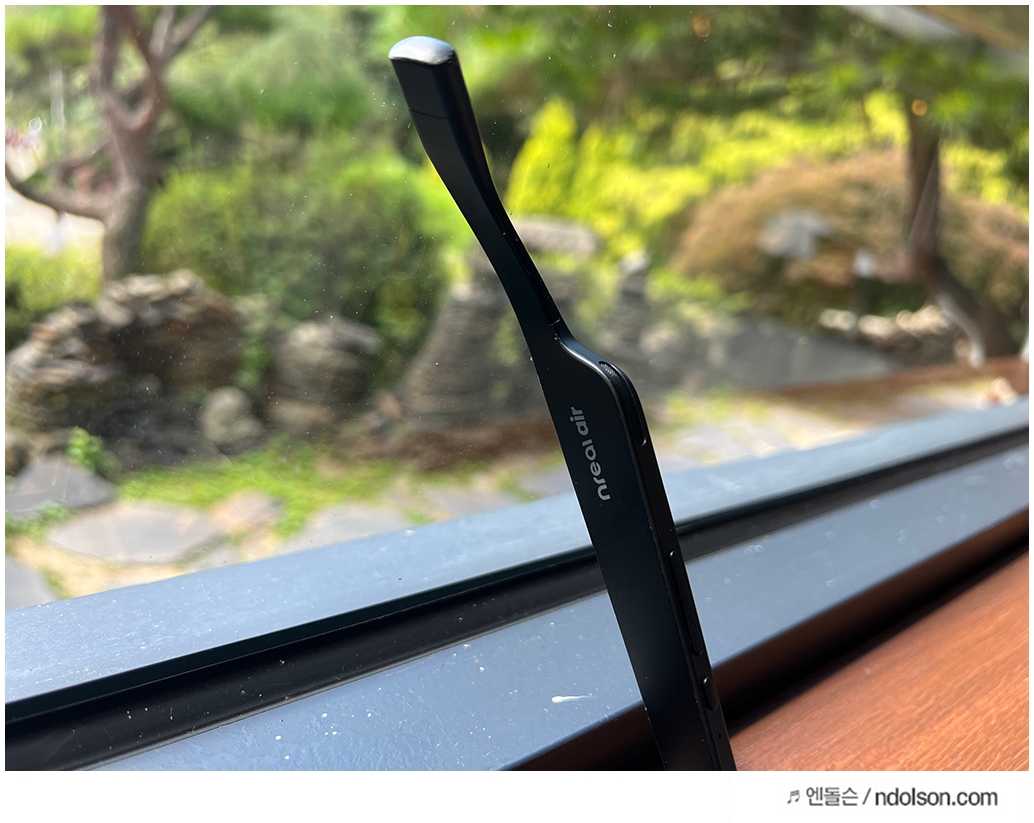 안경테 형태의 AR글래스라면 사용자가 편안한 착용감을 가질 수 있어야겠죠? 그래서 계속 착용해보았는데, 머리 크기에 맞게 40도로 휘어지는 안경테는 대두라도 불편하지 않을 착용감을 보여주었습니다.