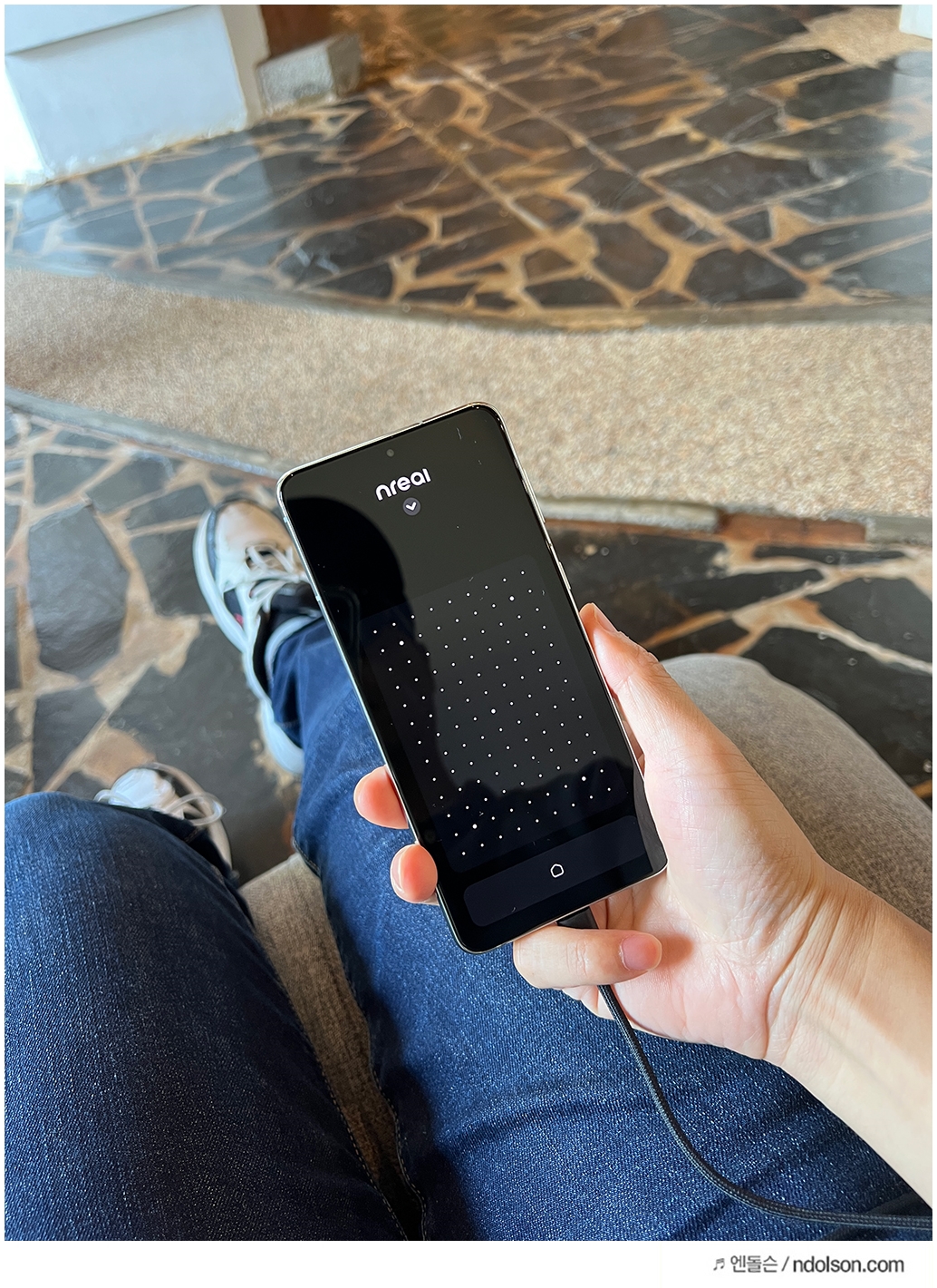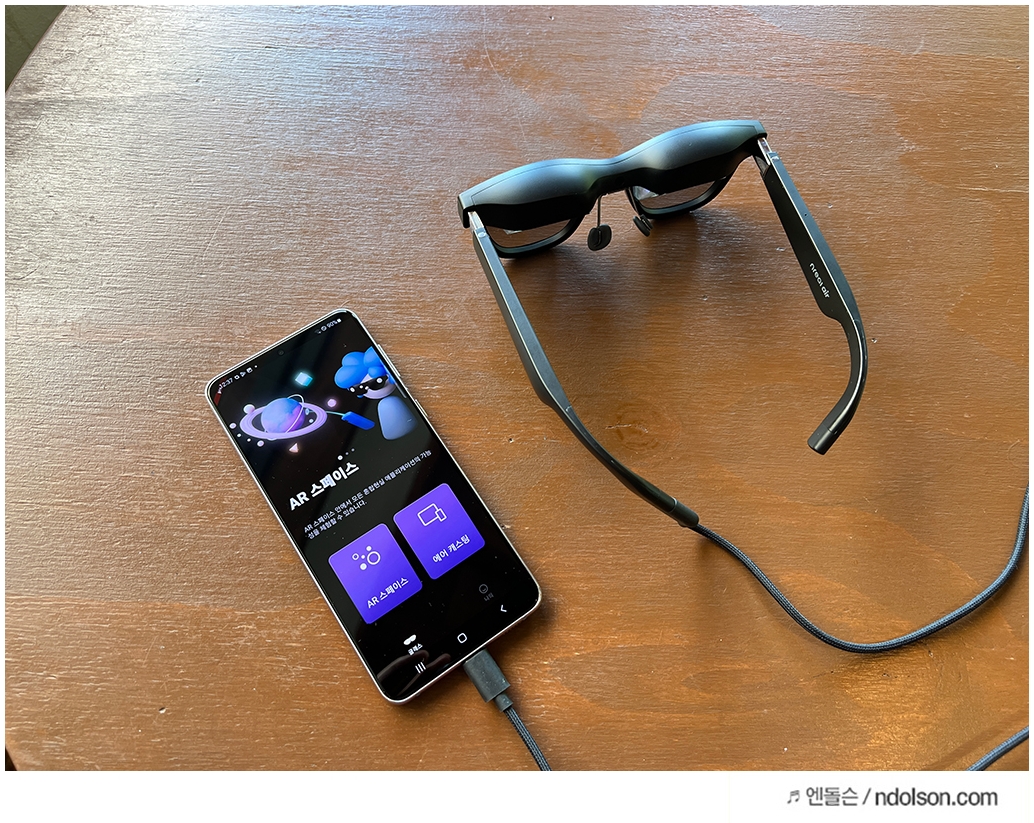 이제 사용 방법을 설명해드려야겠죠? 엔리얼 에어(Nreal Air)는 스마트폰과 연결하여 사용하는 형태로 Type-C HDMI케이블을 연결하면 nebula 앱이 자동으로 실행됩니다.