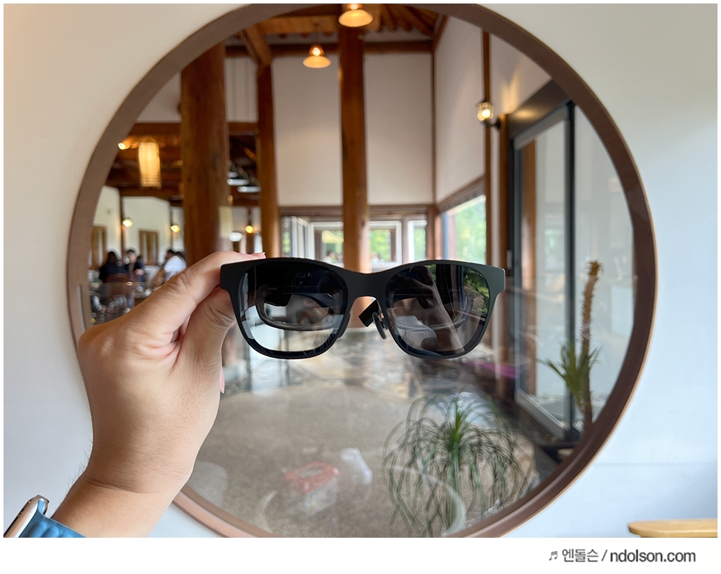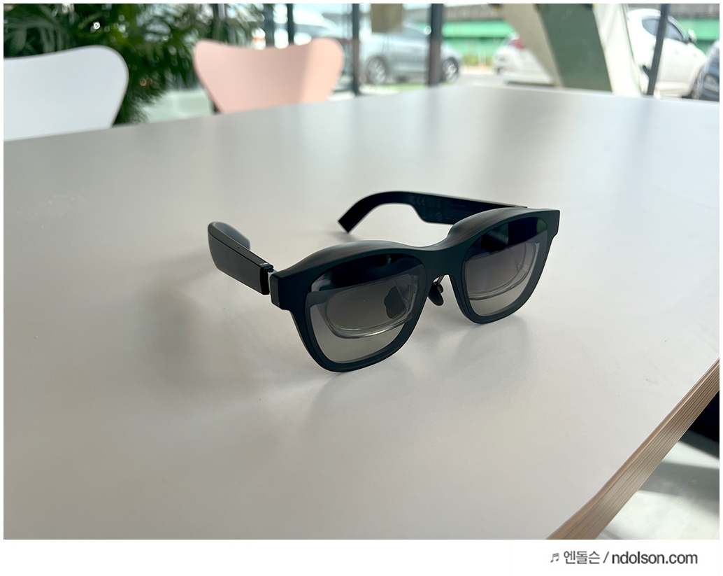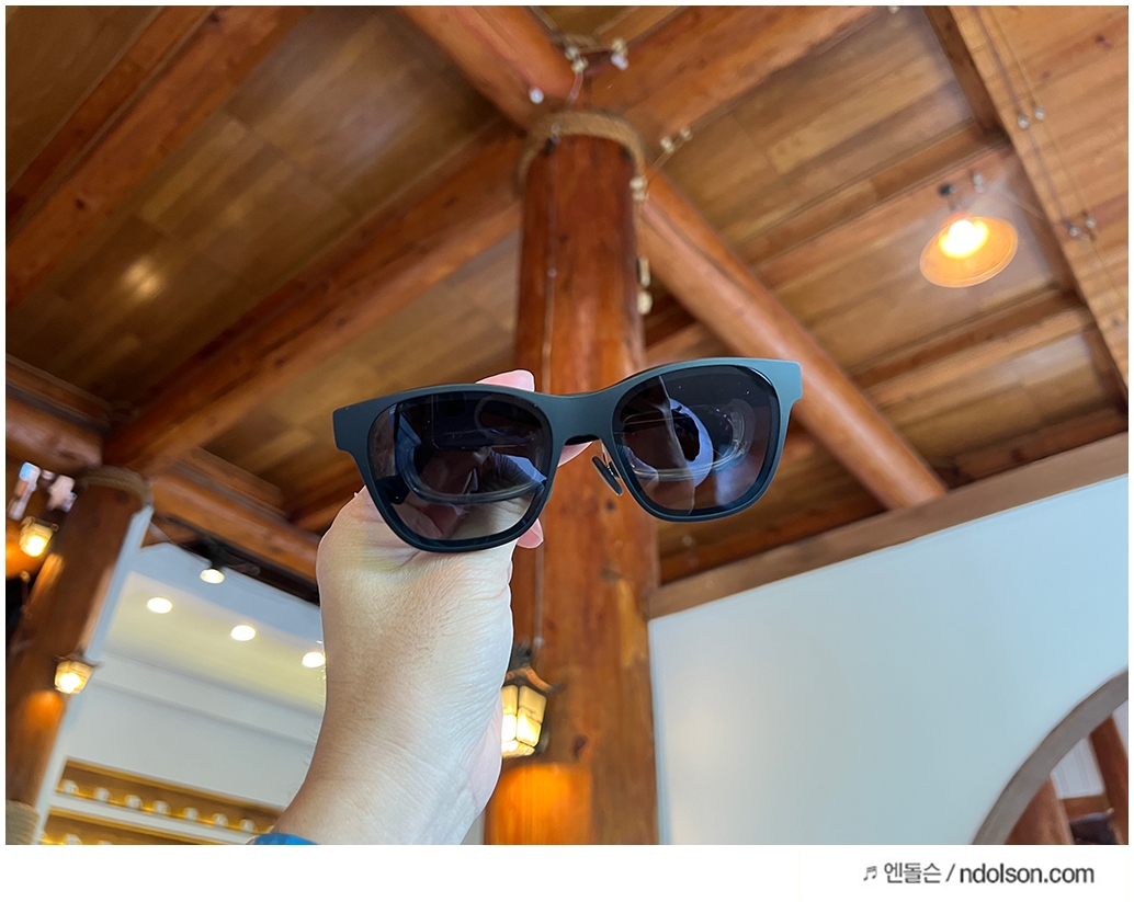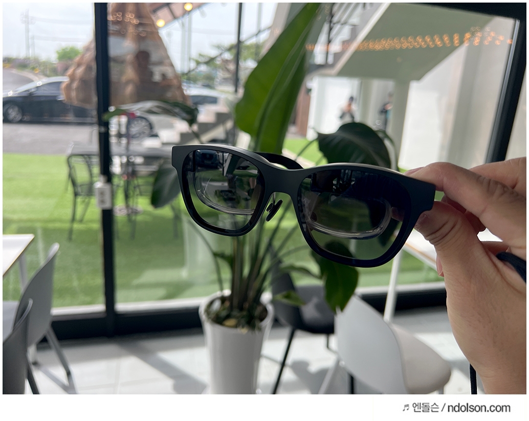 AR 글래스이지만 세련된 선글라스 형태라 카페에서도 큰 부담 없이 사용할 수 있었습니다. 그냥 쓰고 있으면 선글라스라고 생각이 들 겁니다. 또 내가 보고 있는 동영상이 다른 사람에게 보이지 않을까? 제 3자가 유심히 살펴보았는데요. 보이지 않아 사생활 보호도 됩니다.