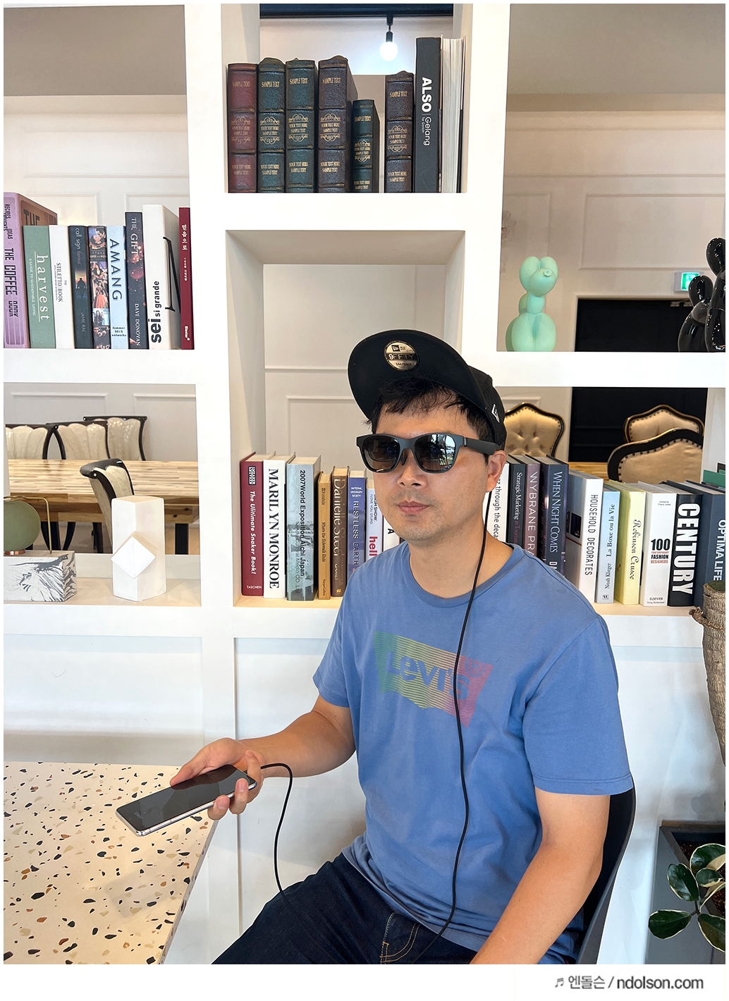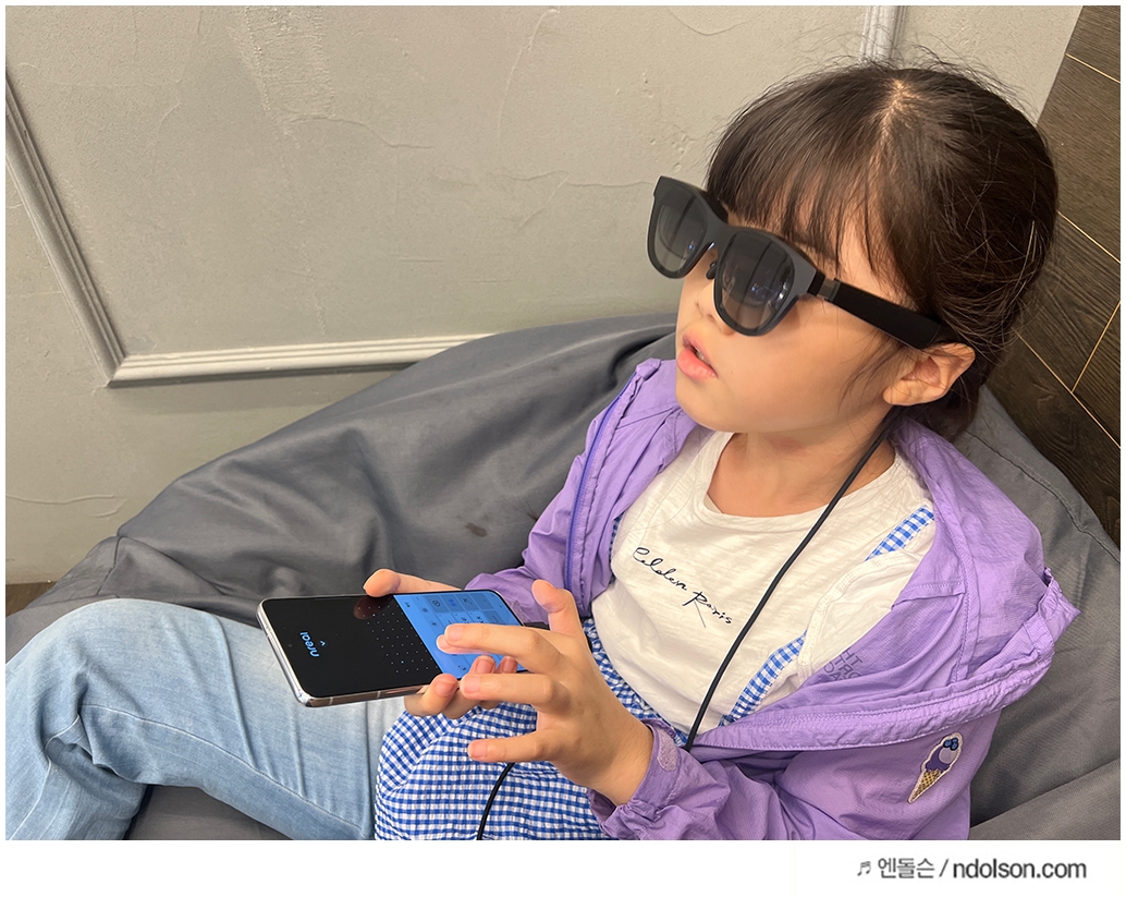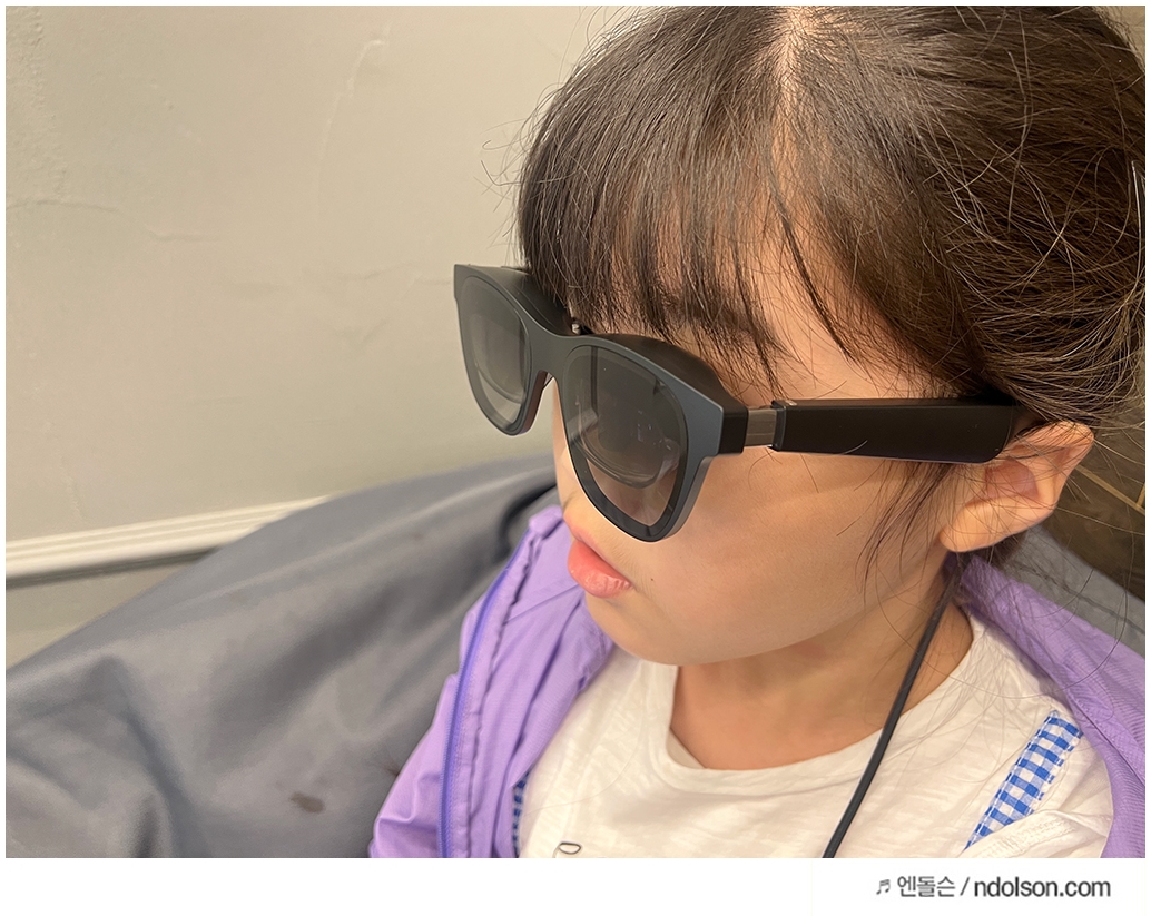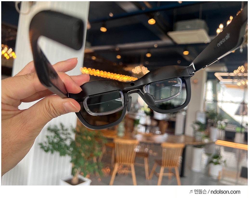 AR 글래스이지만 세련된 선글라스 형태라 카페에서도 큰 부담 없이 사용할 수 있었습니다. 그냥 쓰고 있으면 선글라스라고 생각이 들 겁니다. 또 내가 보고 있는 동영상이 다른 사람에게 보이지 않을까? 제 3자가 유심히 살펴보았는데요. 보이지 않아 사생활 보호도 됩니다.