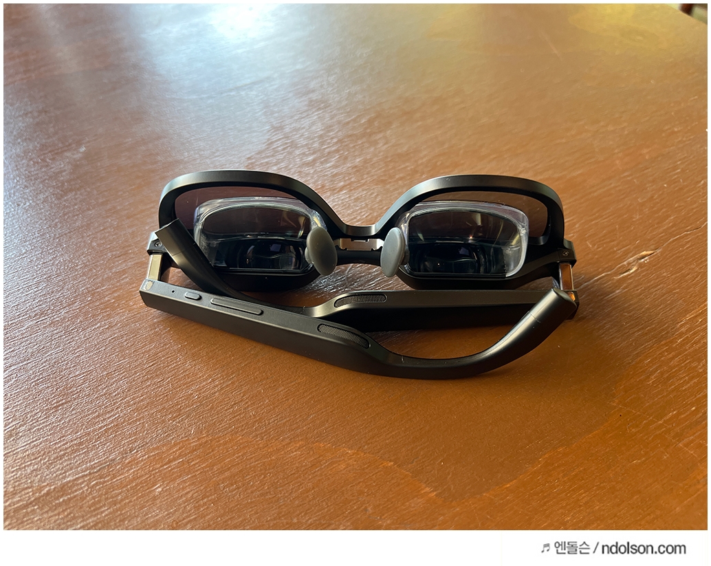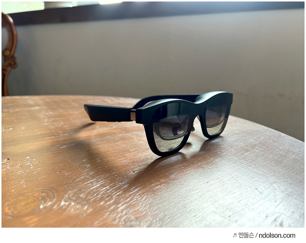 외형은 일반 선글라스를 생각하면 됩니다. 3단계 레이크 시스템이 적용되어 상당히 인체공학적으로 설계되었는데요. AR글래스이지만 가벼울 뿐만 아니라 평상시 착용해도 될 만큼 세련된 선글라스 느낌을 줍니다. 디스플레이 스펙 또한 신경을 썼는데요, 2개의 1080P FHD Sony Micro-OLED 디스플레이가 탑재되어 생생한 화면을 제공합니다.
