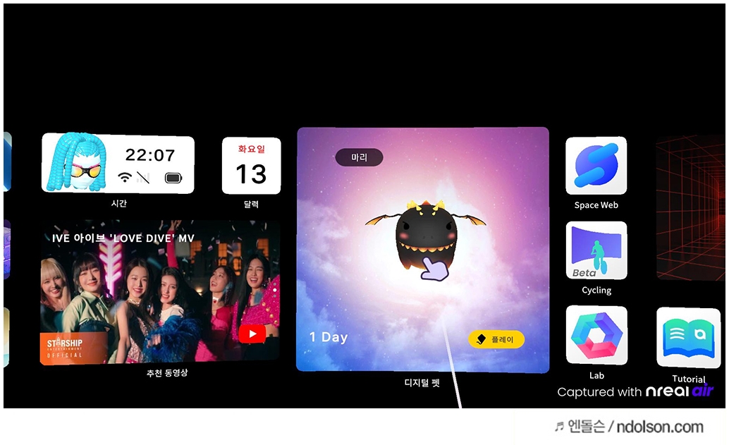 스마트폰에서 나오는 빔과 터치로 화면을 회전하면서 Nreal Air (엔리얼 에어)를 사용할 수 있습니다. 게임, 유튜브, 구글, 인스타그램, 디지털 펫, 브런치, 날씨 등 다양한 앱을 멀티로 띄워서 사용이 가능합니다.