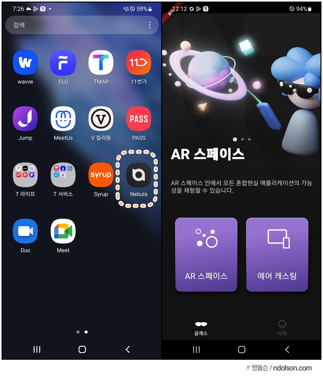 nebula 앱은 AR스페이스와 에어 캐스팅 이렇게 두 가지 모드를 제공합니다. AR 스페이스는 AR앱과 웹페이지 탐색이 가능하며.에어 캐스팅은 연결된 스마트폰 디스플레이를 미러링하여 제공하여 줍니다.