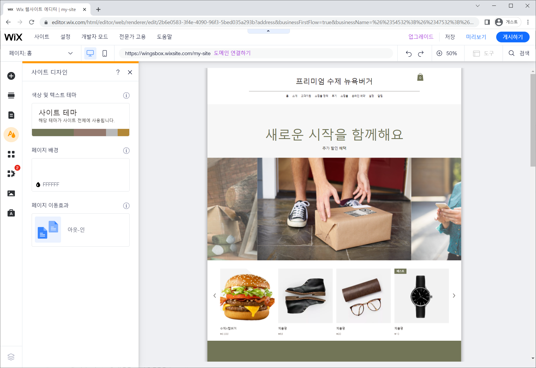 방금 5분도 안돼서 쇼핑몰 사이트 제작을 하였습니다. Wix는 빠르고 쉽게 기능을 더하여 웹사이트를 제작할 수 있다는 장점이 있습니다.