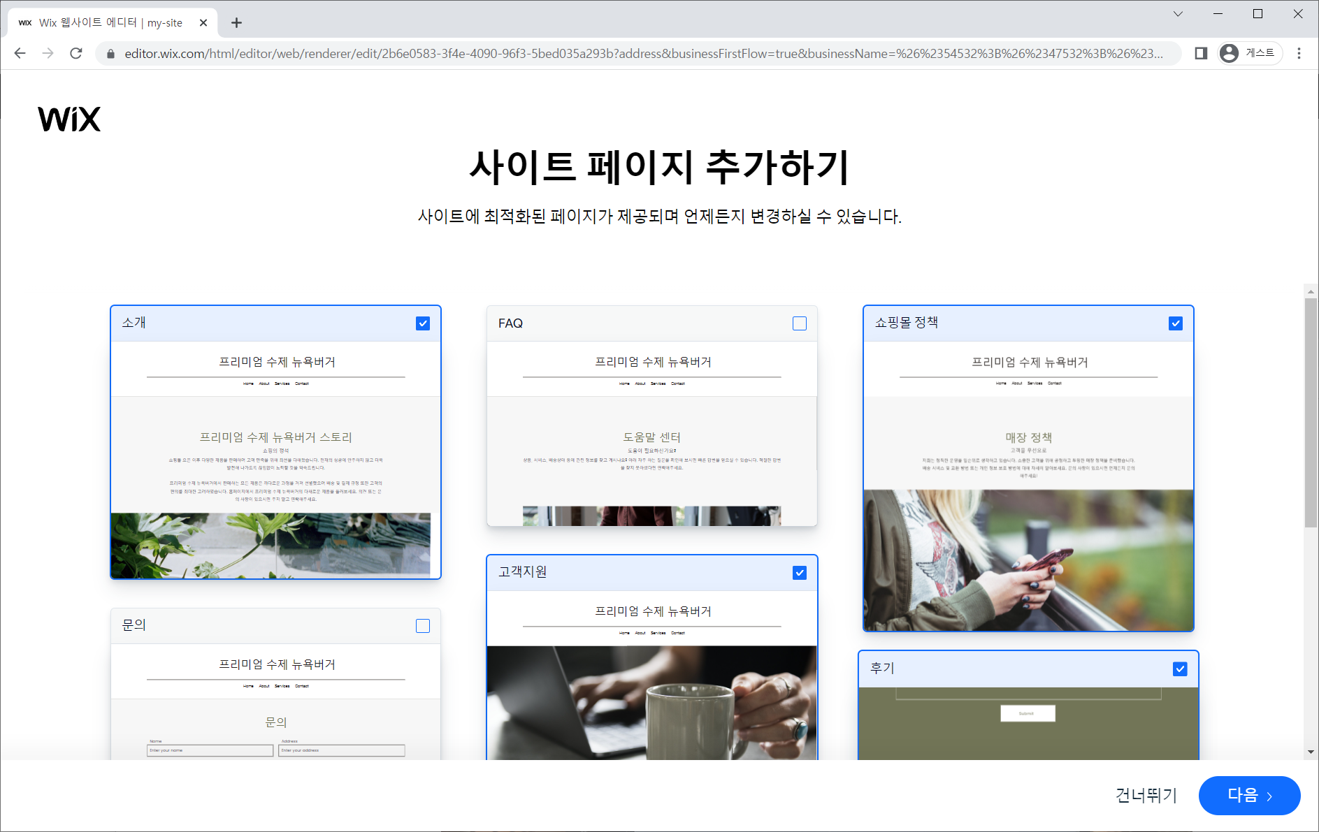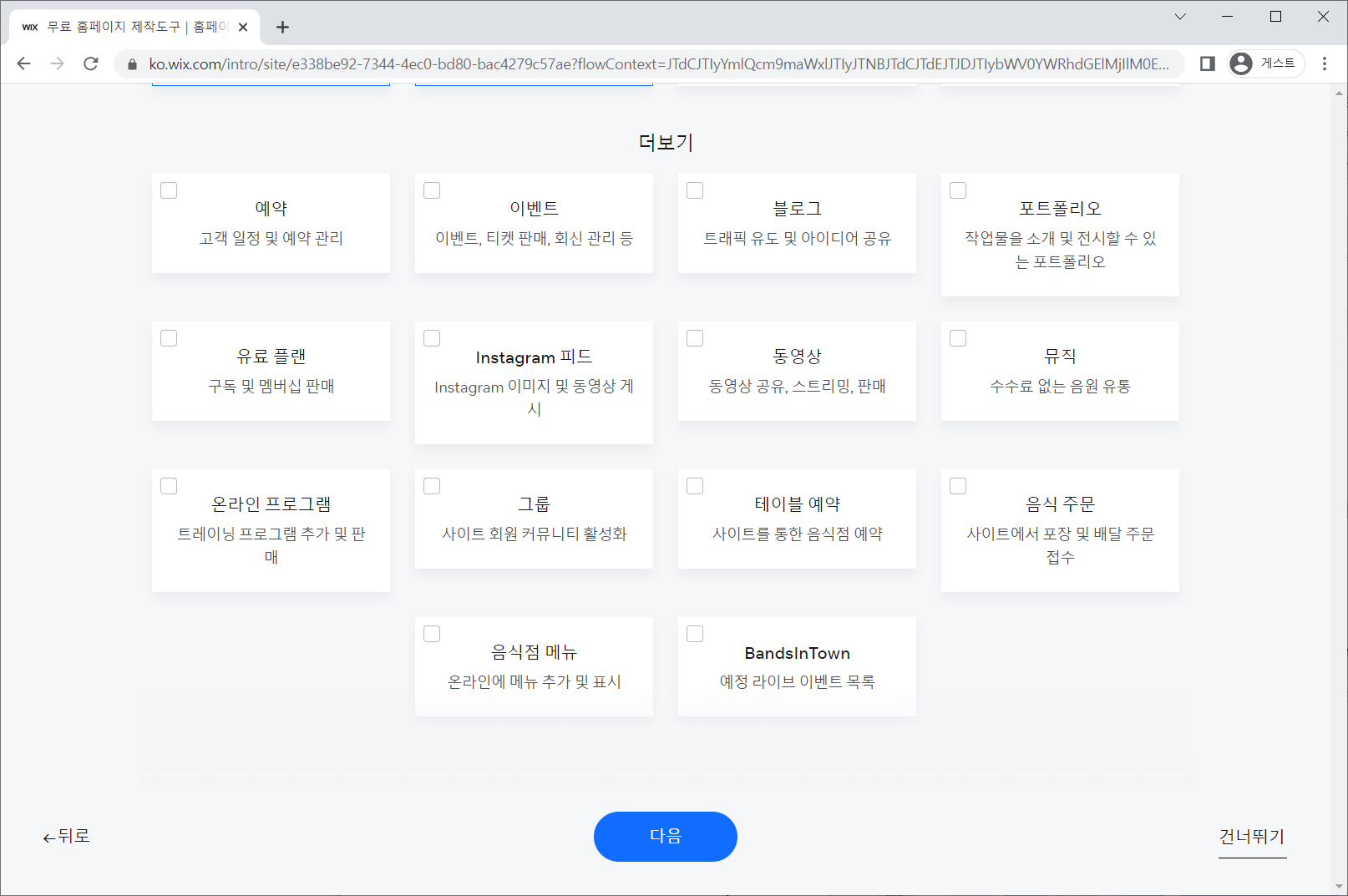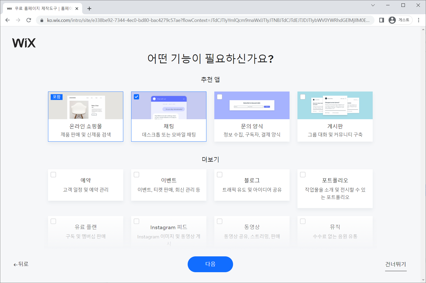 어떤 기능이 필요한지 체크를 해주면 기능 추가가 됩니다. 만들고자 하는 웹사이트의 유형을 고려하여 추가 주면 됩니다. 예를 들어서 추천 앱에는 온라인 쇼핑몰, 채팅, 문서양식, 게시판이 추가되면 좋다고 나옵니다.