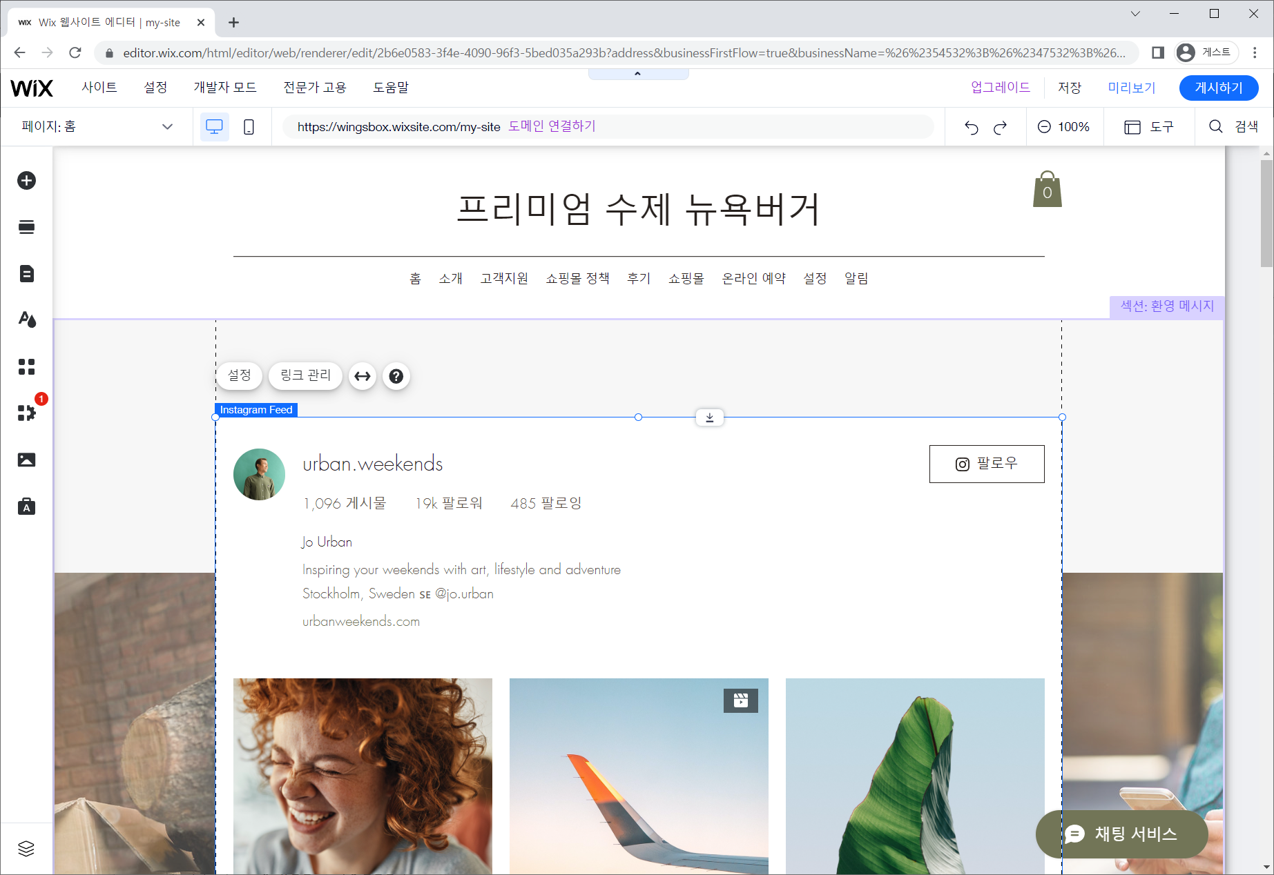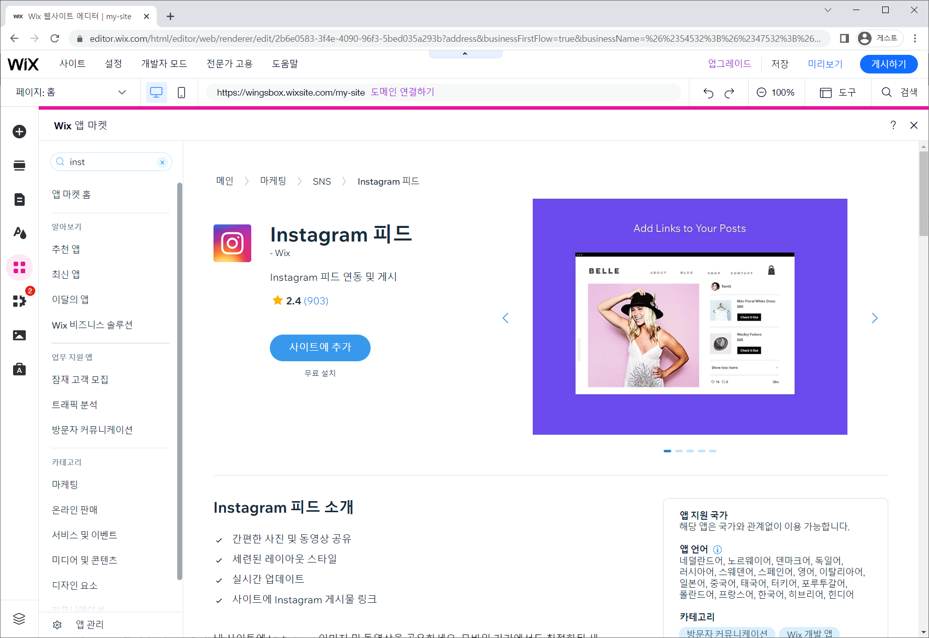 Wix 앱 마켓에는 다양한 Add-In 이 있습니다. 인스타그램(Instagram) 피드를 추가할 수 있는 앱을 찾았는데요. 클릭만 하면 내 웹사이트에 인스타그램 피드가 연동됩니다.