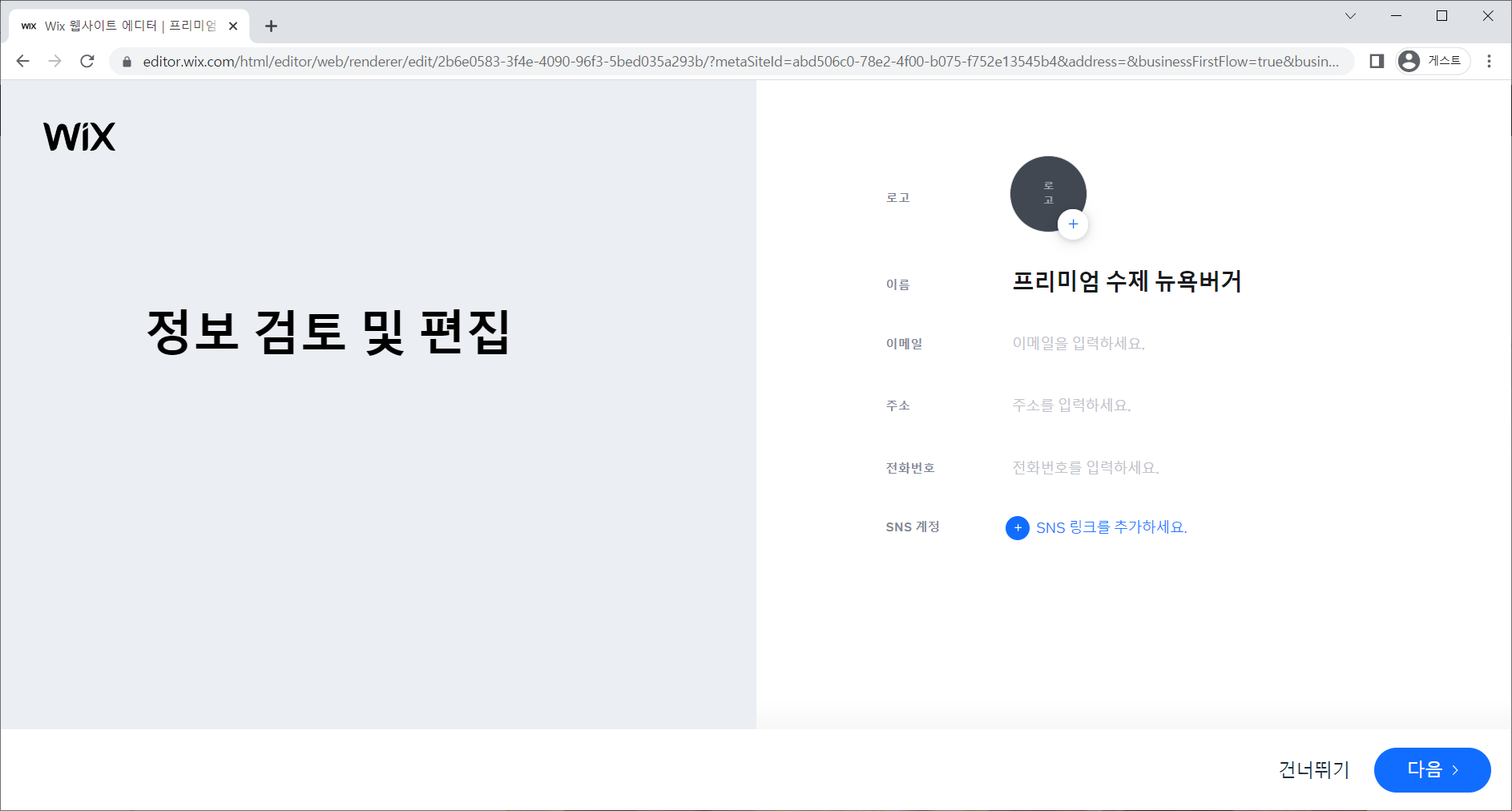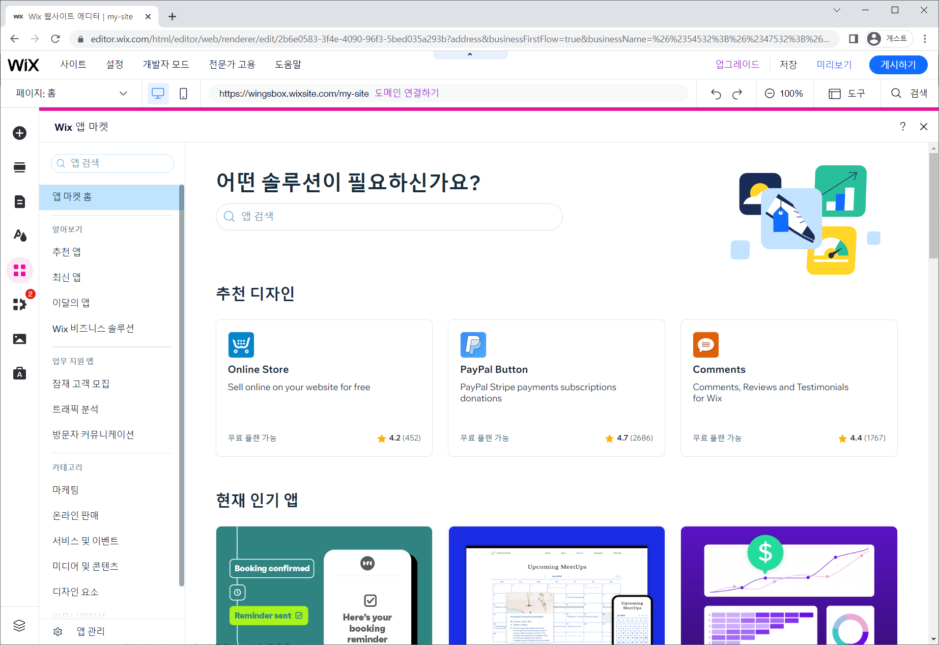 에디터로 이동을 해서 요소 추가나 페이지 및 메뉴, 앱 추가를 할 수 있습니다.