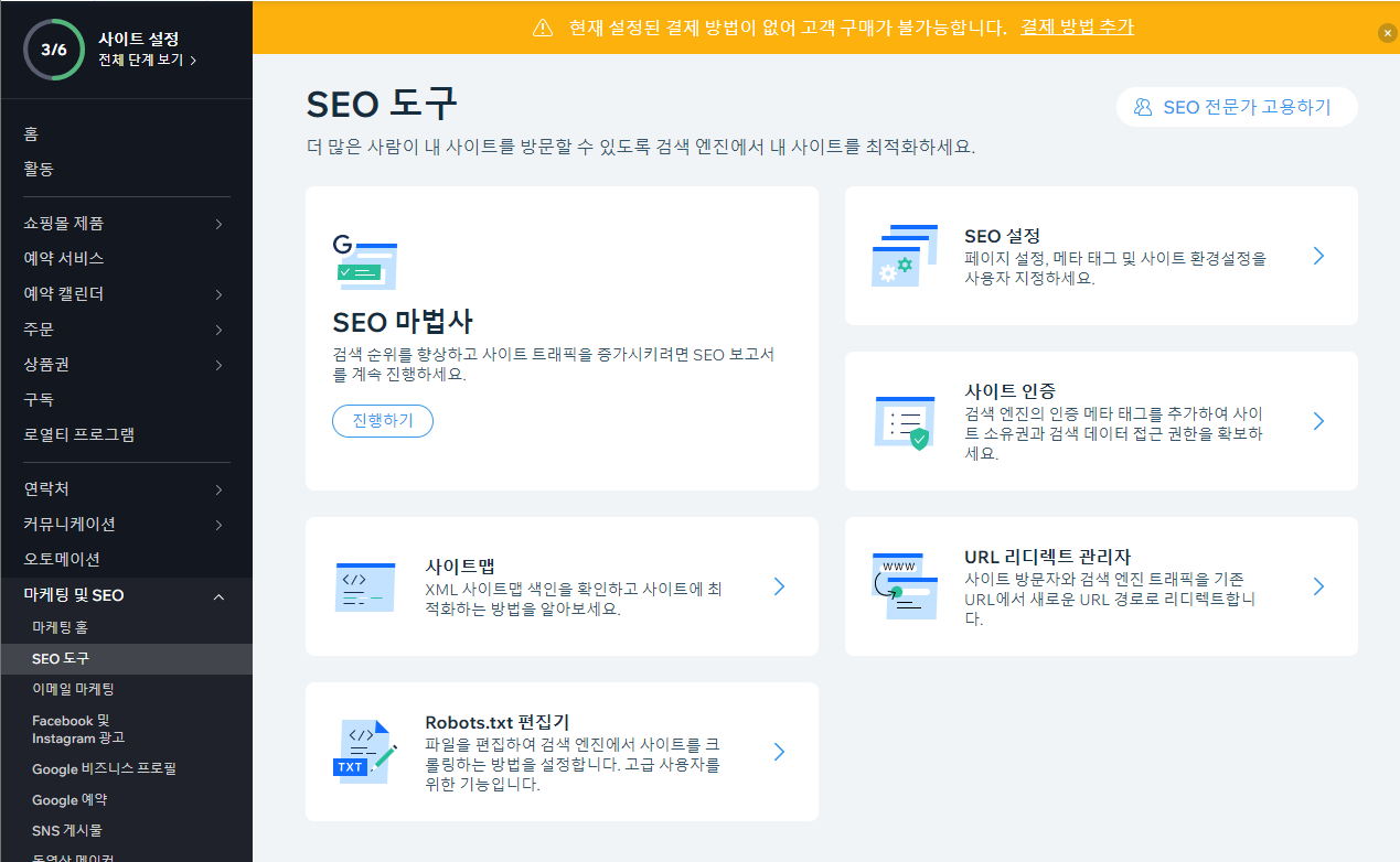 설정을 더 자세히 보면, 검색 엔진 최적화(영어: search engine optimization, SEO) 도구도 제공됩니다. 검색 엔진으로부터 웹사이트나 웹페이지에 대한 웹사이트 트래픽의 품질과 양을 개선을 진행할 수 있어 더 잘 검색되게 할 수 있습니다.