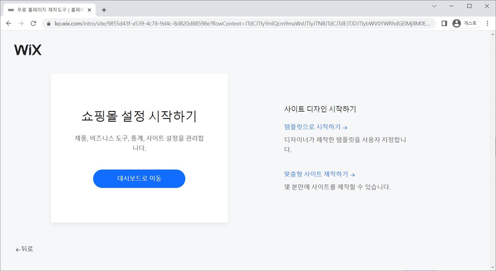 쇼핑몰 상세 설정을 하기 위해 대시보드로 이동을 눌러줍니다. 그 외에도 템플릿으로 시작하기, 맞춤형 사이트 제작하기를 할 수 있습니다.