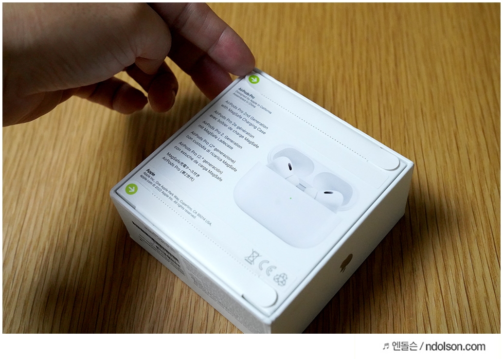 에어팟 프로 2세대의 패키지 박스는 크게 달라진 것이 없습니다. 전면의 사진이 나란히에서 사선으로 변경되었네요.