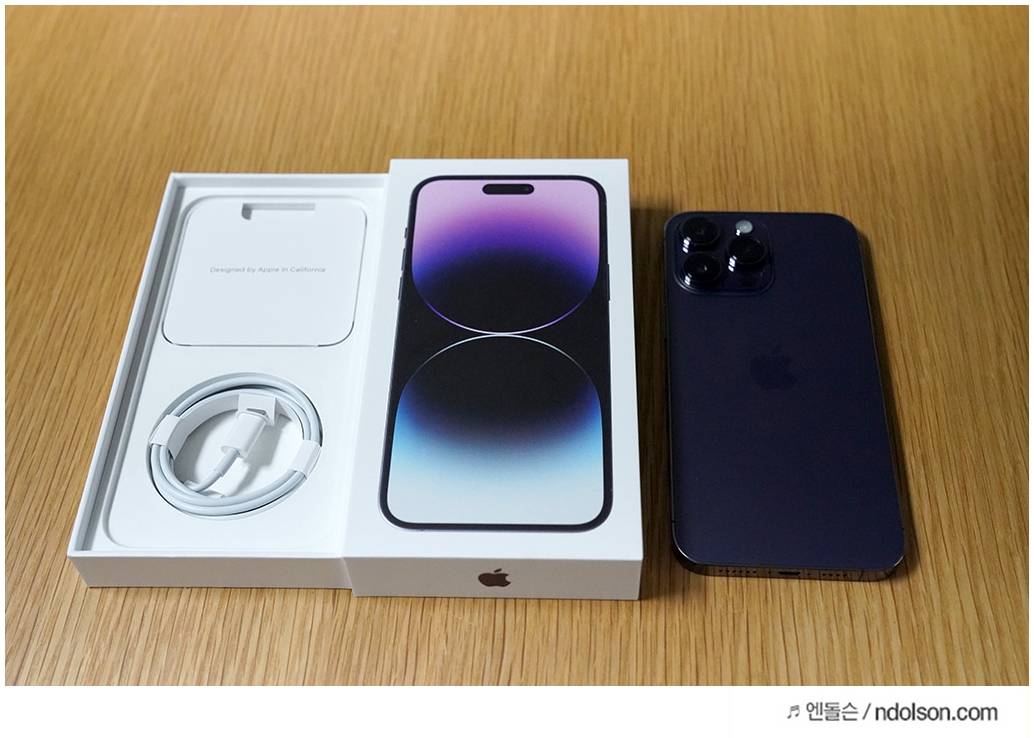 아이폰14 프로 맥스 딥퍼플 색상을 구매하였습니다. 아이폰13 vs 아이폰14 패키지를 나란히 두었습니다. 아이폰14 역시 패키지 박스를 보면, 색상과 모델을 쉽게 유추할 수 있게 디테일하게 디자인되어 있습니다.