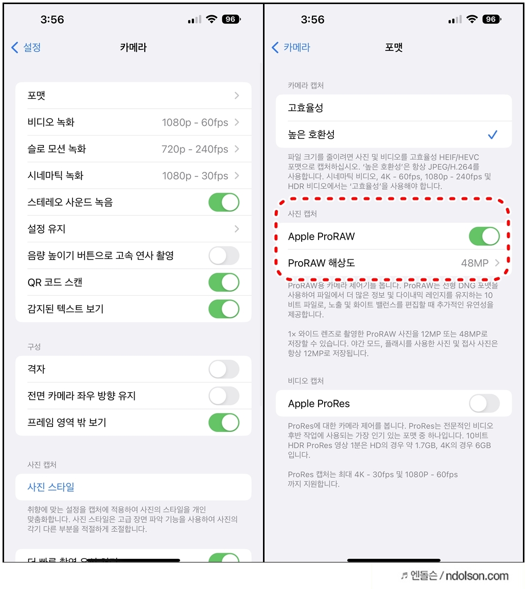 아이폰의 Raw 모드로 촬영하려면, 설정 > 카메라 > 포맷에서 해당 기능을 설정하면 됩니다. Apple ProRAW 를 켠 후 ProRAW 해상도에 4,800만 화소가 선택됐는지 확인하시면 됩니다.