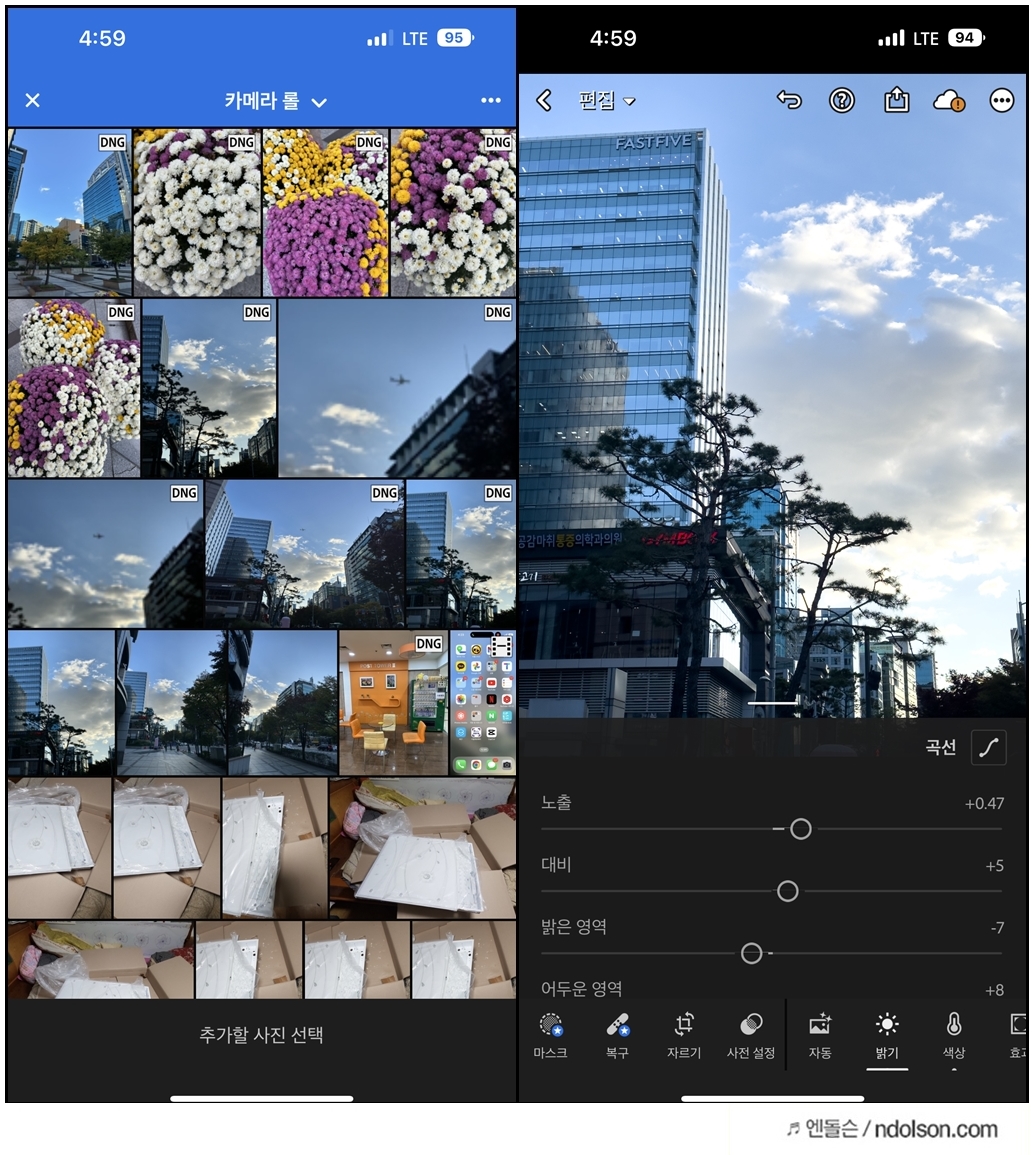 LIGHTROOM 앱을 이용하면 DNG 파일을 편집하고 수정할 수 있습니다. 고퀄리티로 사진을 수정 편집할 수 있다는 점이 좋네요.