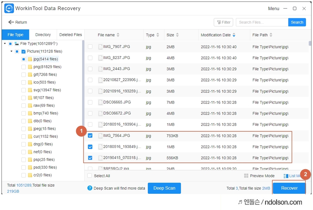 *Deep Recovery 는 심층 복구 모드로 보다 면밀하게 삭제된 파일을 스캔하여 보여줍니다.