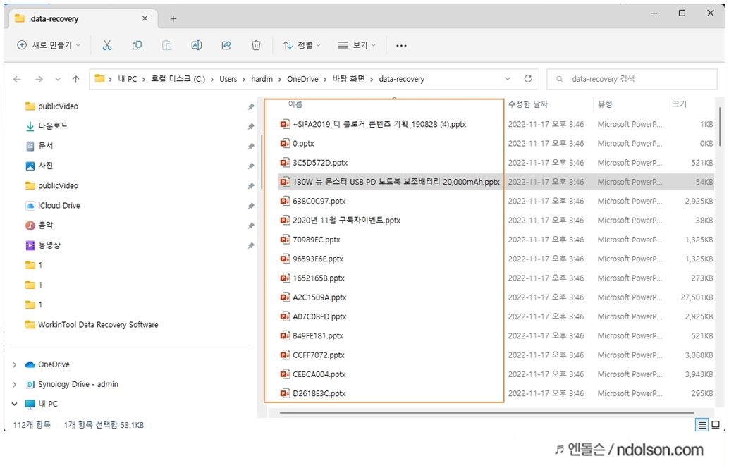 삭제된 파워포인트 문서들의 종류를 선택하여 복구 하였습니다. 복구 전에 용량을 볼 수 있어 일부 확인이 가능했습니다.