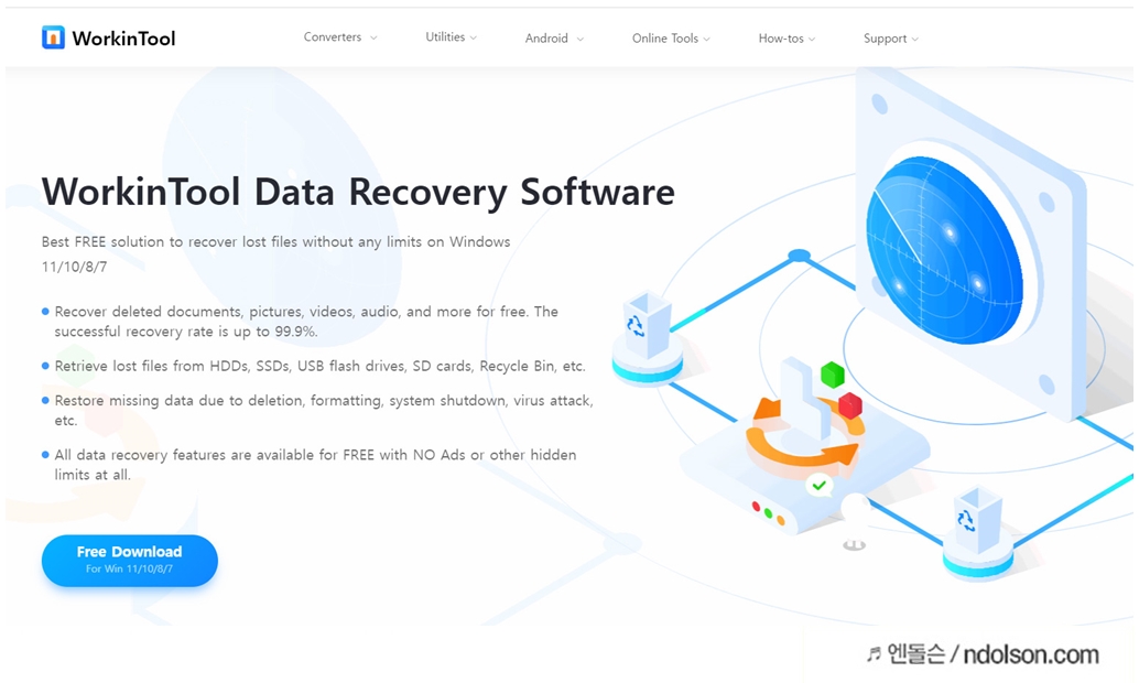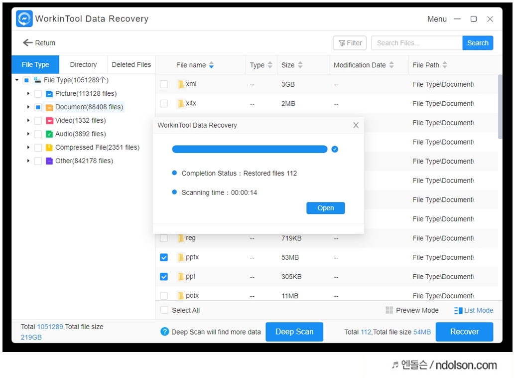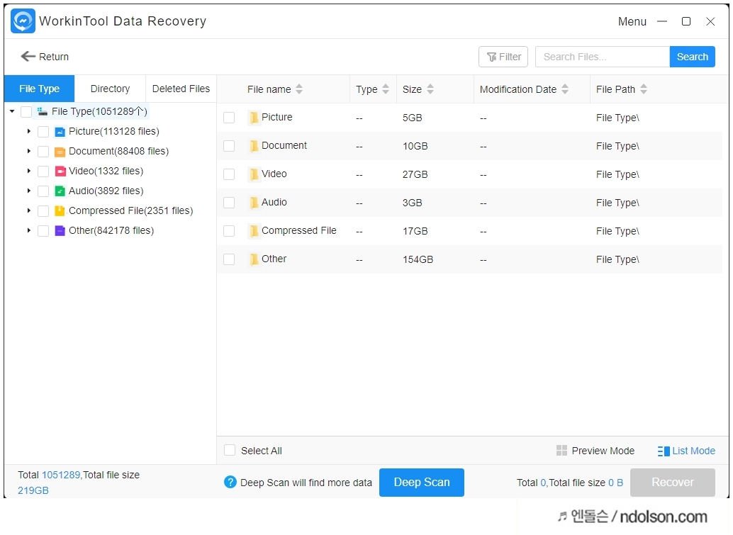 복구 전문 솔루션 업체를 방문해도 되지만, 시간이 없고 개인이라면 빠르게 전문 파일 복구 프로그램인 WorkinTool Data Recovery를 써보셔도 좋습니다. 무료 파일 복구 프로그램이지만, 1000가지 이상의 파일 유형을 복구할 수 있어 좋습니다.