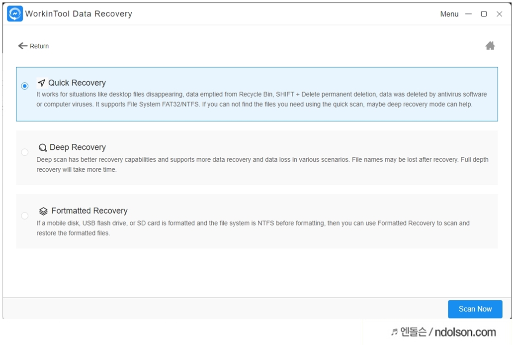 *Quick Recovery 는 빠른 복구 모드로 최근 삭제하였거나 빠르게 스캔하여 파일을 복구할 수 있습니다.