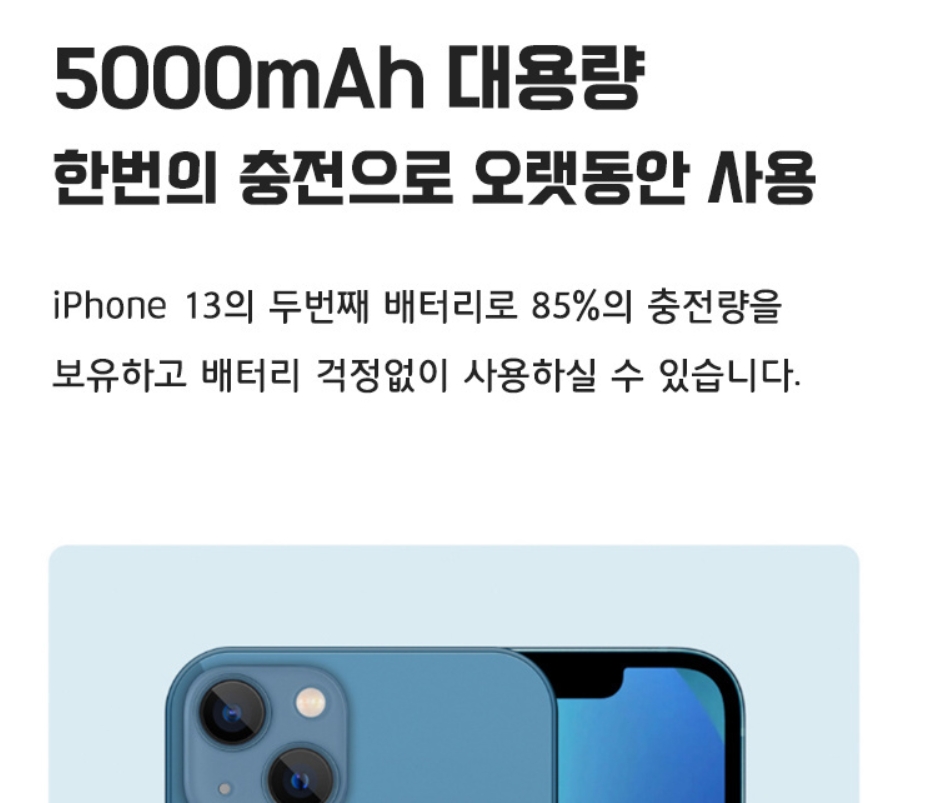 배터리는 5000mAh 이므로 아이폰13 기준으로 85% 정도만 충전이 가능해 부족하지 않을까 하는 생각이 듭니다. 하지만, 급할 때 쓰는 용도로는 나쁘지 않을 듯합니다.