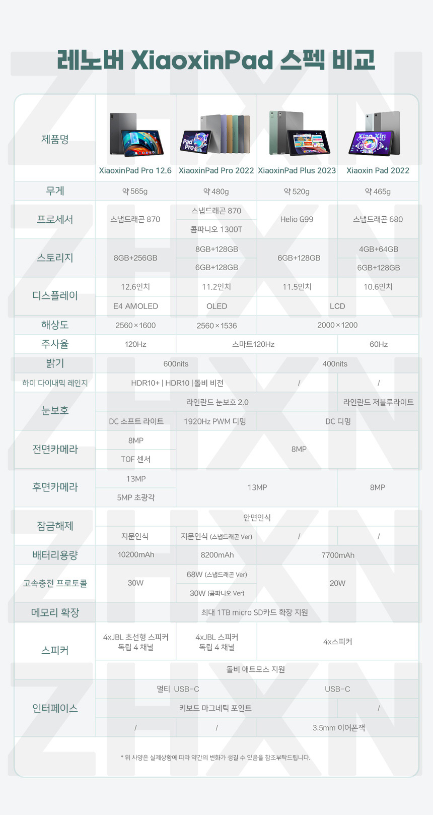 * P11 Plus (중급형 모델) : 스냅드래곤 750G / 6GB, 8GB RAM / 128GB, 256GB 저장용량 / 11인치