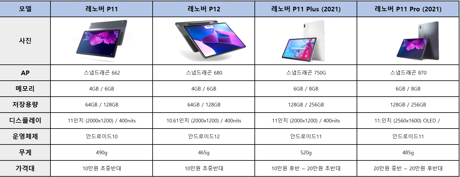 * P12 (P11 2022 버전) : 스냅드래곤 680 / 4GB, 6GB RAM / 64GB, 128GB 저장용량 / 10.61인치