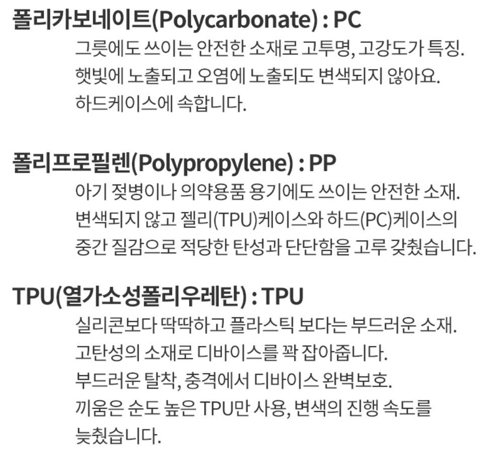 TPU는 많이 들어 보셨을 겁니다. 젤리케이스로 말랑말랑해서 좋지만, 변색의 우려가 큽니다. 변색 안되게 하려면 특별한 기술이 있어야 할 겁니다. 끼움 케이스는 변색이 되지 않는다고 하는데요.