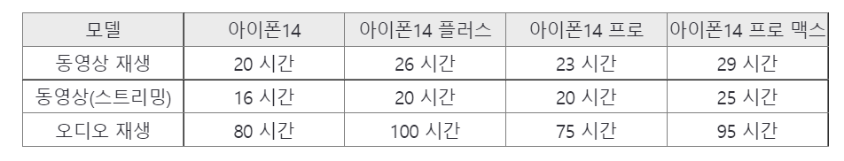 아이폰14 재생시간은 역시 프로 맥스 모델이 더 깁니다.