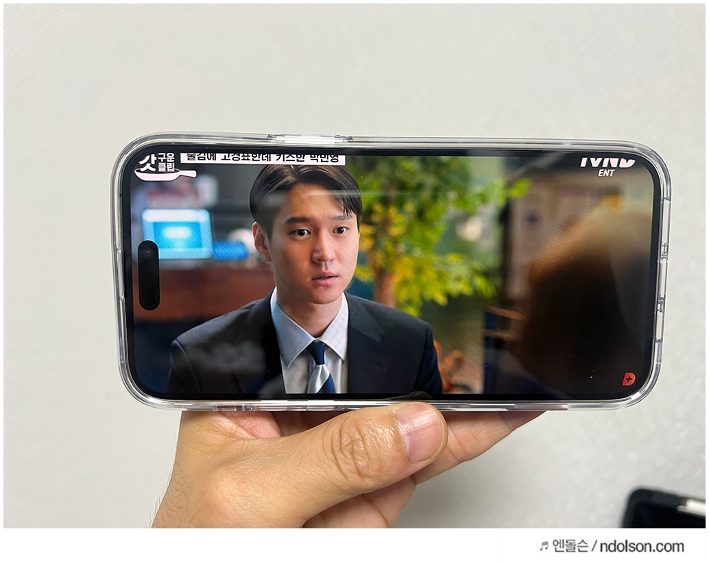아이폰14의 화면을 가득 채우게 확대하여 동영상을 시청하면 여전히 화면을 다이나믹 아일랜드가 가립니다. 갤럭시 스마트폰은 화면에 가득 찬 동영상 재생이 가능하죠?
