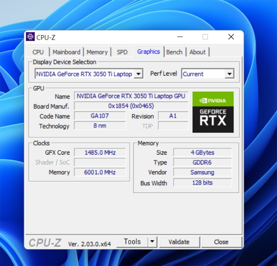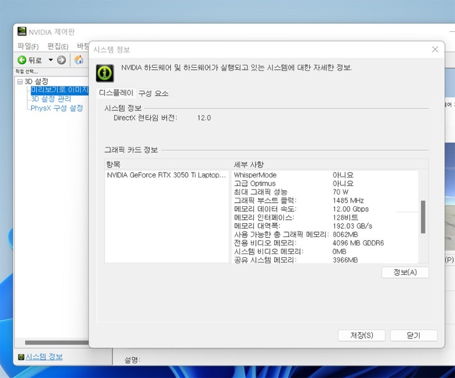 디스플레이 정보에서도 확인할 수 있듯 외장 그래픽 카드 세부 사항을 보면, 최대 그래픽 성능 70W로 NVIDIA GeForce RTX 3050Ti 그래픽카드는 최상급에 가까운 전력과 클럭을 보여줍니다.