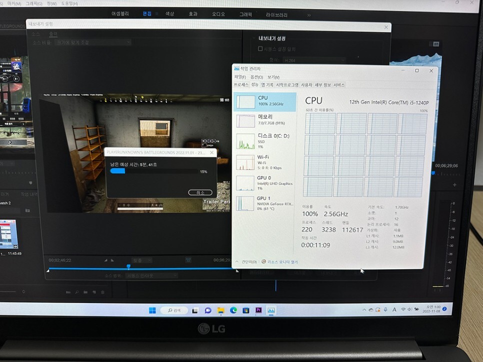 영상을 렌더링하여 인코딩하니 CPU와 메모리, GPU 사용량이 증가하였습니다. 고성능 프로세스를 갖추어야지만, 영상 편집시 시간 소모가 적은데 고사양 노트북의 장점을 즐길 수 있었습니다.
