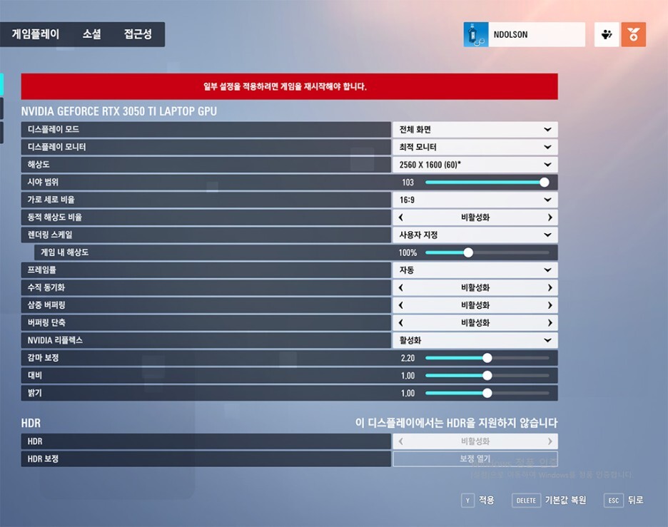 오버워치 2 옵션은 2560x1600 해상도, 60fps 로 즐겼습니다. 프레임은 자동이며, 수직동기화는 비활성화하였습니다. 옵션 타협으로 중간 옵션을 하였습니다.