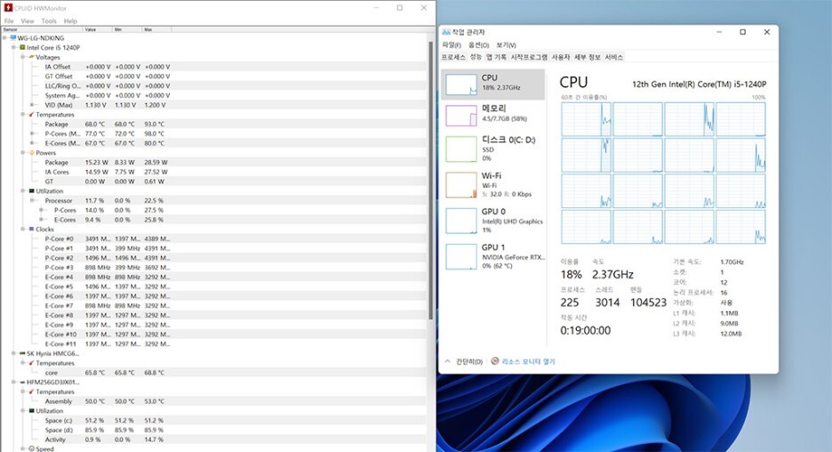 이 정도면 듀얼 모니터가 아니라도 노트북에서 아쉬울 수 없게 멀티 작업이 순조롭습니다.