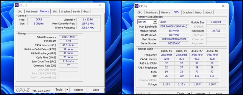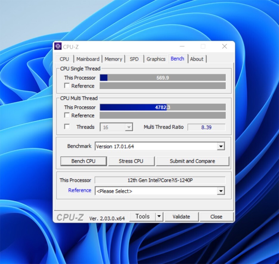 벤치마크 프로그램은 CPU-Z를 통해서 스펙 정보를 정확히 확보해 보았습니다. 인텔의 가장 최신 12세대 CPU인 엘더레이크로 코어i5-1240P 프로세스가 탑재되었습니다. DDR5 8GB 2400MHz 의 램이 탑재되었습니다.