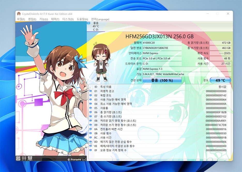 SSD는 256GB 용량으로 제품 정보를 툴을 이용하여 정확히 확보해 보았습니다. SSD가 HDD보다 성능이 우수하다는 장점은 다들 아실 것 같습니다.