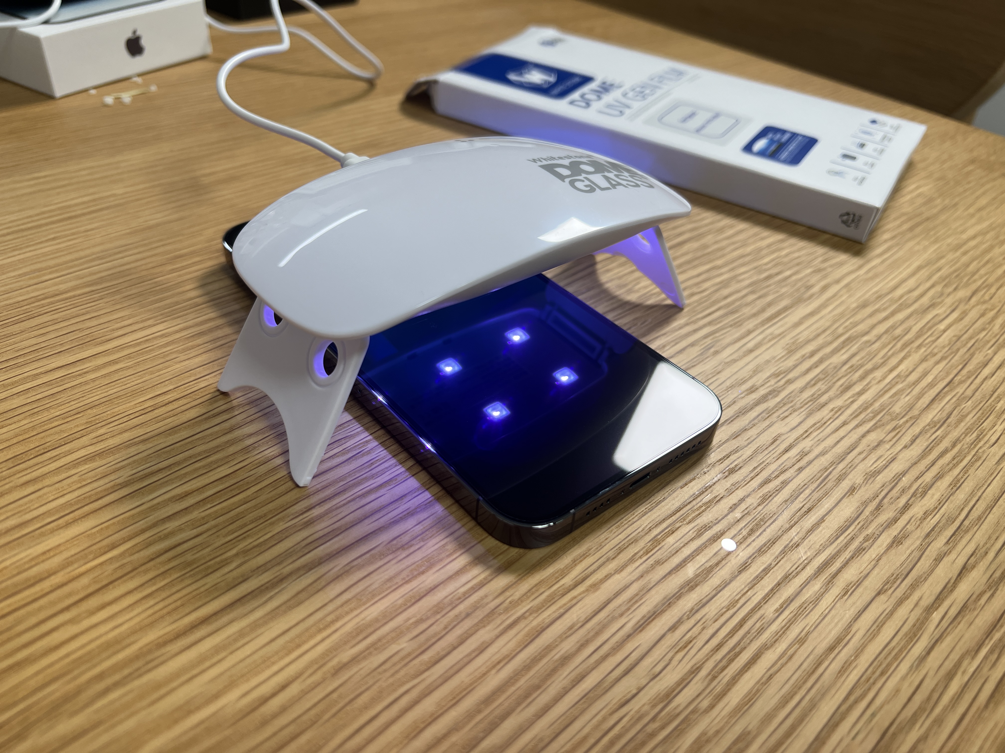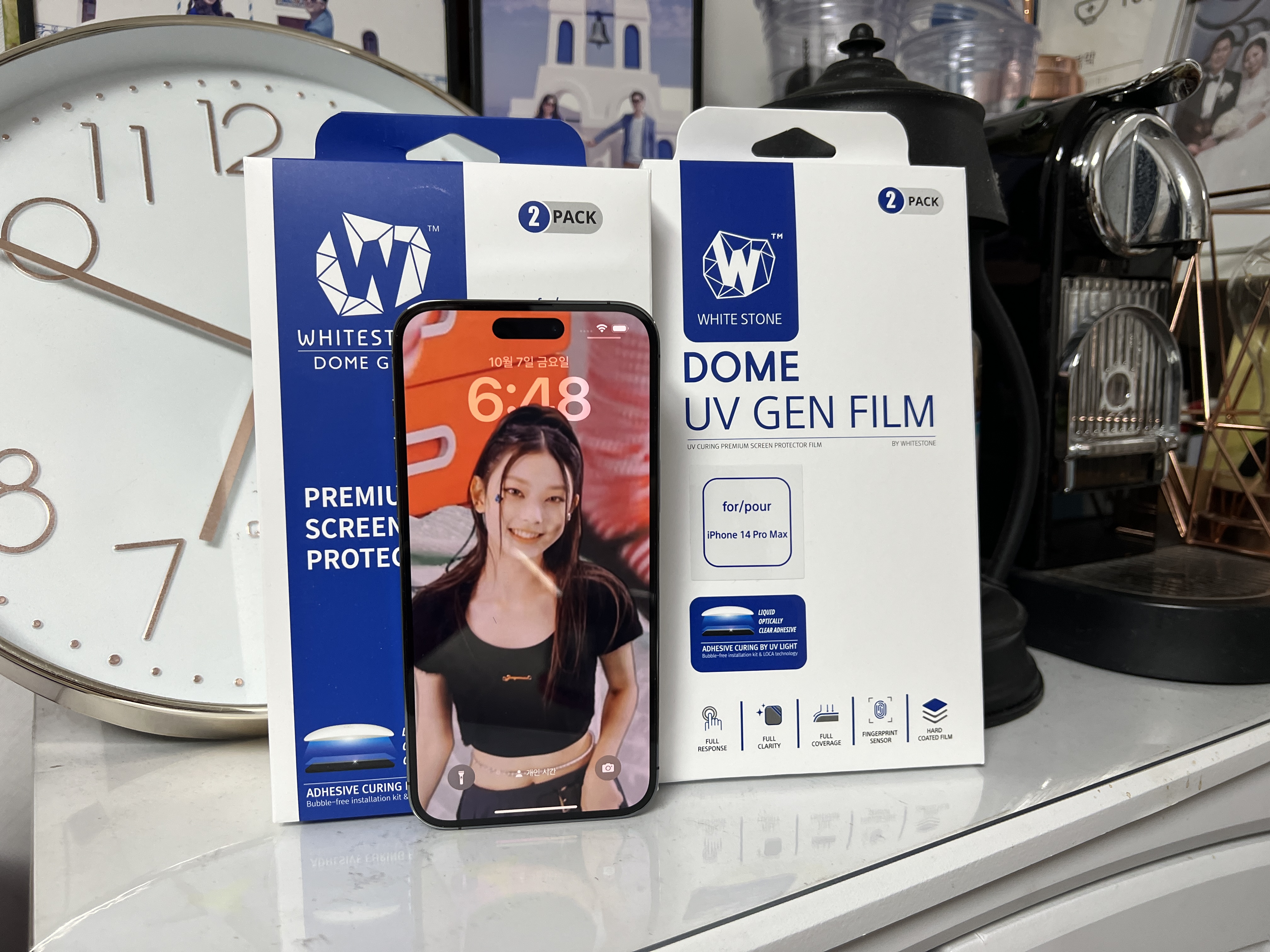 필자는 이번에는 아이폰14 보호필름으로 전문 보호필름 업체인 화이트스톤의 아이폰14 신제품 UV Gen필름을 부착했습니다. UV경화기로 경화해주면 심플하게 부착이 됩니다.