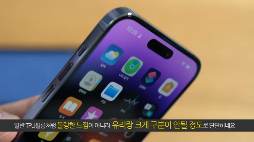 아이폰14에 보호필름을 부착해보니 물렁한 필름이 아니라 유리처럼 단단해 생폰 같은 느낌을 주었습니다.