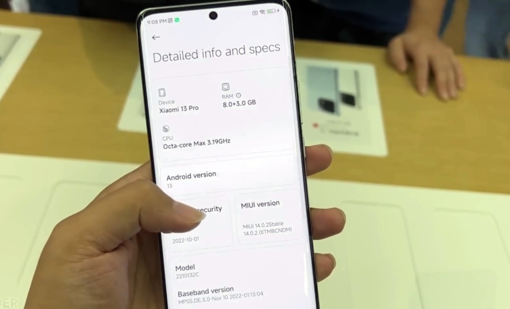 스냅드래곤 8 Gen2, LPDDR5X 메모리, UFS 4.0 스토리지, 4820mAh 배터리, 샤오미 Surge G1 전원 관리 칩, 120W 유선/50W 무선/10W 역 충전, 돌비 아트모스 스테레오 스피커, IR 블래스터, IP68 방진/방수. 트리플 5천만 화소 카메라, 소니 IMX989 1인치 센서는 f/1.9 조리개의 라이카 렌즈와 메인 카메라 구성, 3배 줌 라이카 플로팅 렌즈에 f/2.0 조리개와 초점 거리 10cm, 14mm f/2.2 초광각 AF. 샤오미 13 시리즈 발표. 라이카 카메라 탑재